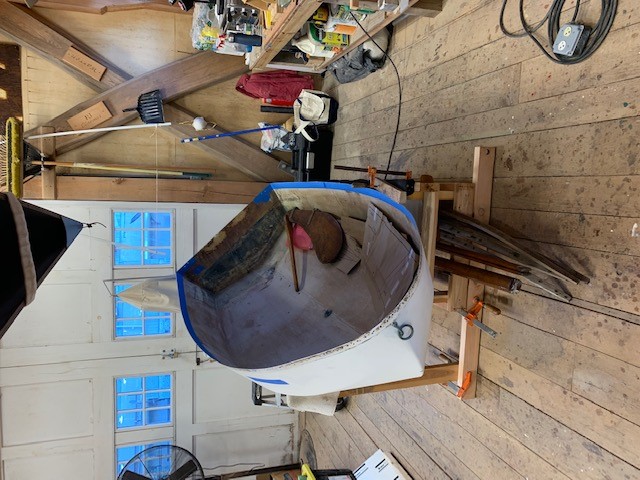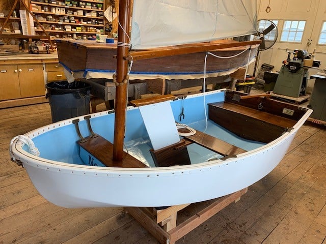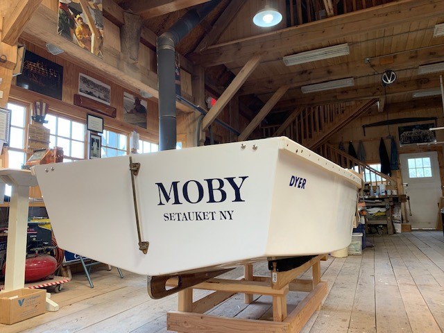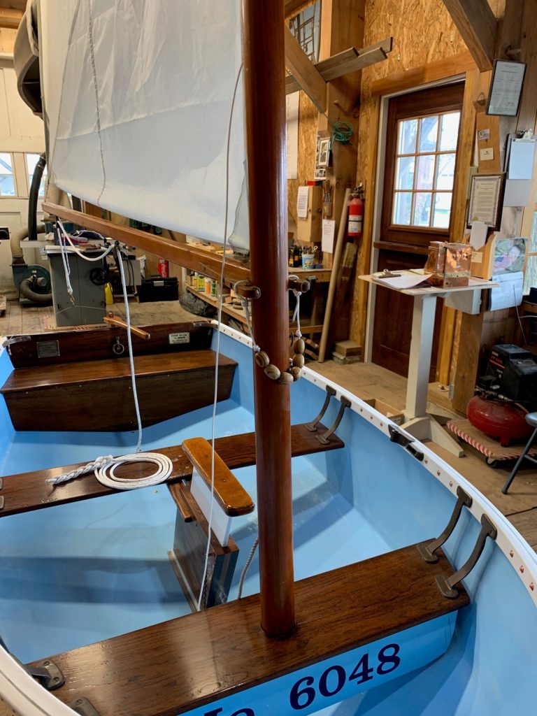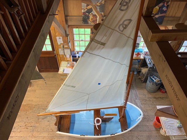 Moby is a 7′-11″ dinghy that was originally constructed 48 years ago as a row version by the Anchorage, Inc., in Warren Rhode Island. It was mostly used as a tender on the Hudson River.In 2019 it underwent a complete restoration at the Bayles Boat Shop in Port Jefferson Harbor, NY where a great group of volunteers help preserve maritime history. Here, it was converted to sail version, clamp and guard was replaced, a period correct sail kit including a Ratsey & Lapthorn sail was sourced.