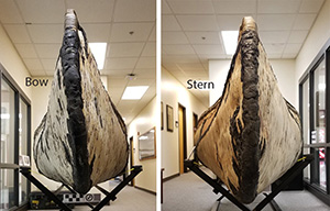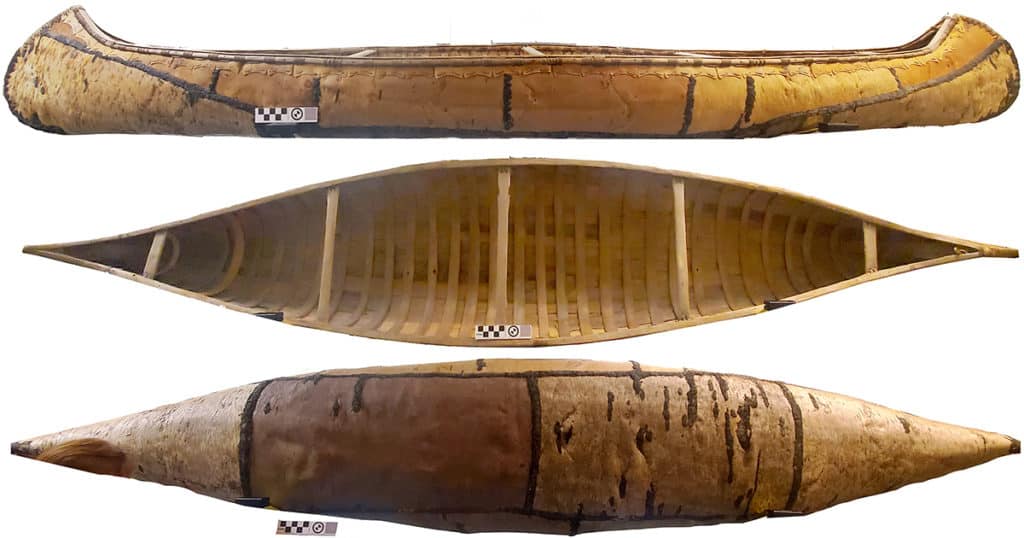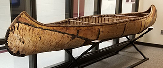 This birch-bark canoe was built to a traditional Ojibwa form and is similar in design and construction to bark canoes since before European contact. Muskeego was used for wilderness canoeing in the Boundary Waters Canoe Area, harvesting wild rice, netting whitefish, and public interpretive programs at Ely Folk School in Ely, Minnesota, and at North House Folk School in Grand Marais, Minnesota. In 2010 Muskeego appeared in the film “Rendezvous with History: A Grand Portage Story.” It also appeared in photoshoots for advertisements and a Discovery Channel “How It’s Made” segment in 2017. Muskeego was acquired by the Museum of Underwater Archaeology in 2019 and is currently on display in the History Department at Georgia Southern University in Savannah, Georgia.