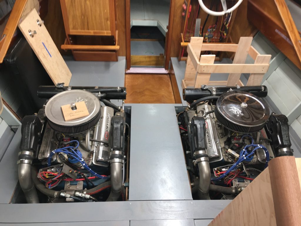 RestoModOne of 52 twin 26′ Cutlass’s made between 1966-68. Complete gut of hull, deck, and transom. Complete paint strip and refinish, new everything including mahogany decks (CNC laser cut and fitted); wood framed windshield; custom made SS steering, engine brackets, exterior SS; SS rudders; SS 5″ exhaust with built in flappers; all wiring and gauges are new; teak grated decks; custom built HD trailer (all new wheels, bearings, brakes, wiring, tires, everything). Engines are 350’s bored .030 over; Eldebrock manifolds and carbs; all new parts and accessories; cam break in only; FWC; Paragon tranny’s; dripless shaft seals.