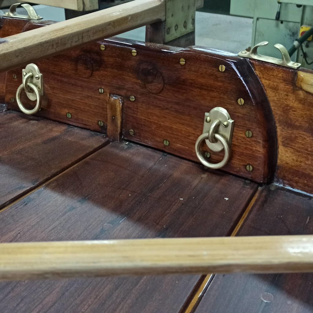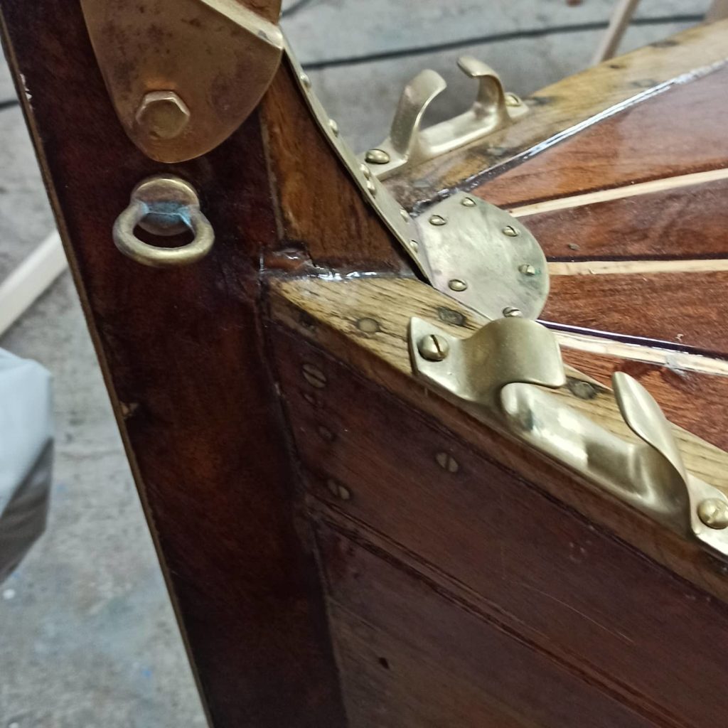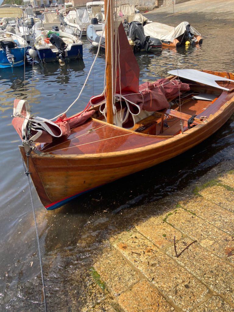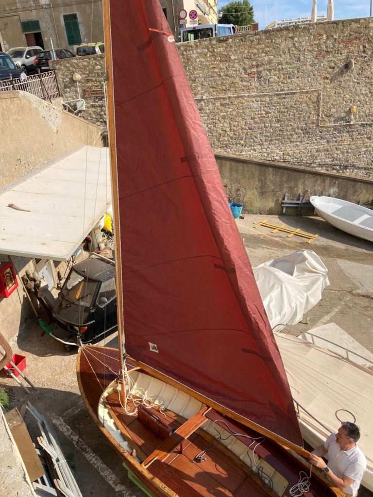Full original onboard equipment in full brass and rare bakelite camcleat (the plastics origins), Original tanbark sails on the Marconi rig. Now in Piombino (LI) historical marina XIV century, is a lovely strong dinghy you really feel comfortable and safe to sail with. You would be really surprised to row and see how fast it can be. The hull is a masterpiece of efficiency and the original full-body oars with original leather are amazing beauties that I use to have as home decors in my sea view home.