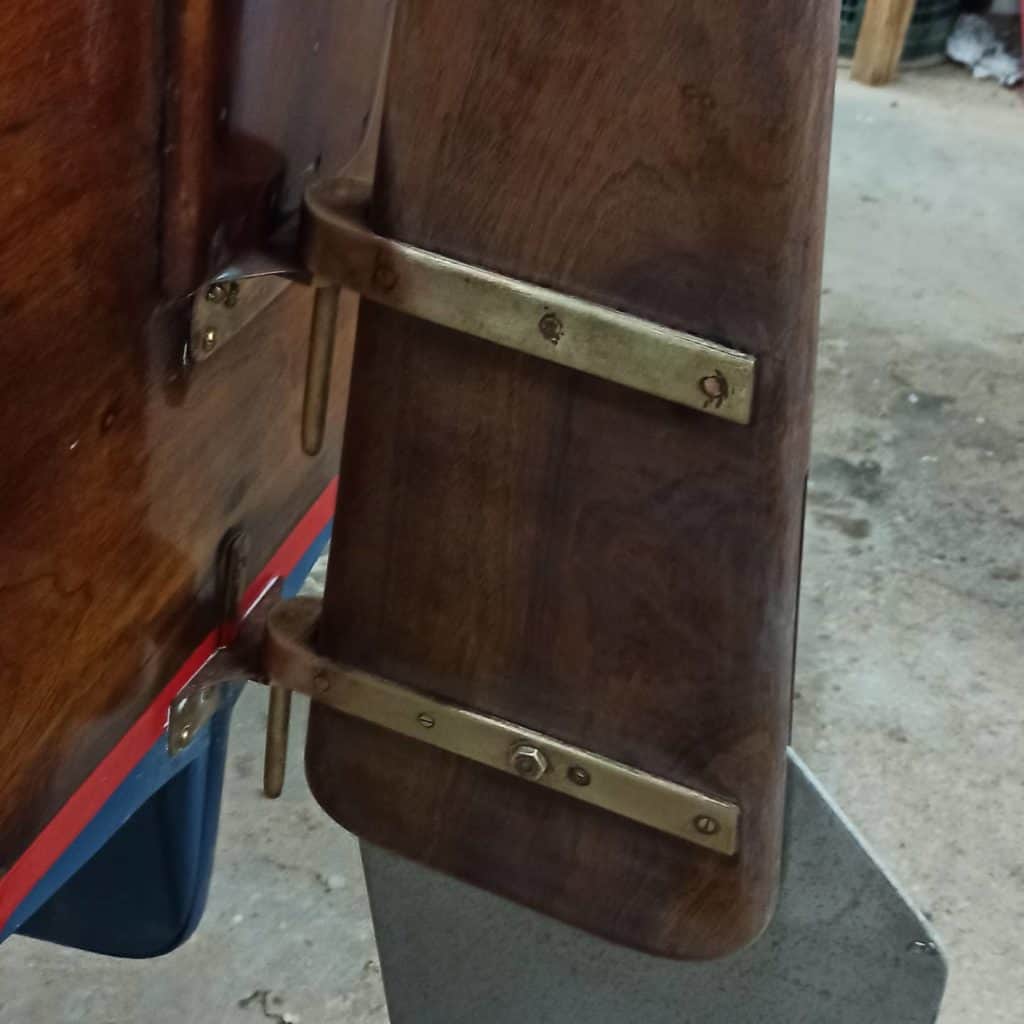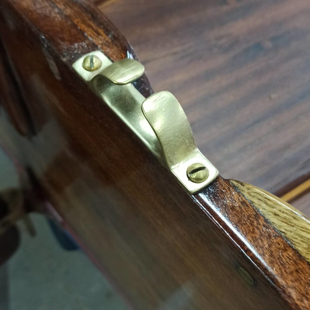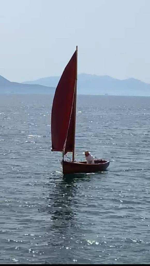 Full original onboard equipment in full brass and rare bakelite camcleat (the plastics origins), Original tanbark sails on the Marconi rig. Now in Piombino (LI) historical marina XIV century, is a lovely strong dinghy you really feel comfortable and safe to sail with. You would be really surprised to row and see how fast it can be. The hull is a masterpiece of efficiency and the original full-body oars with original leather are amazing beauties that I use to have as home decors in my sea view home.