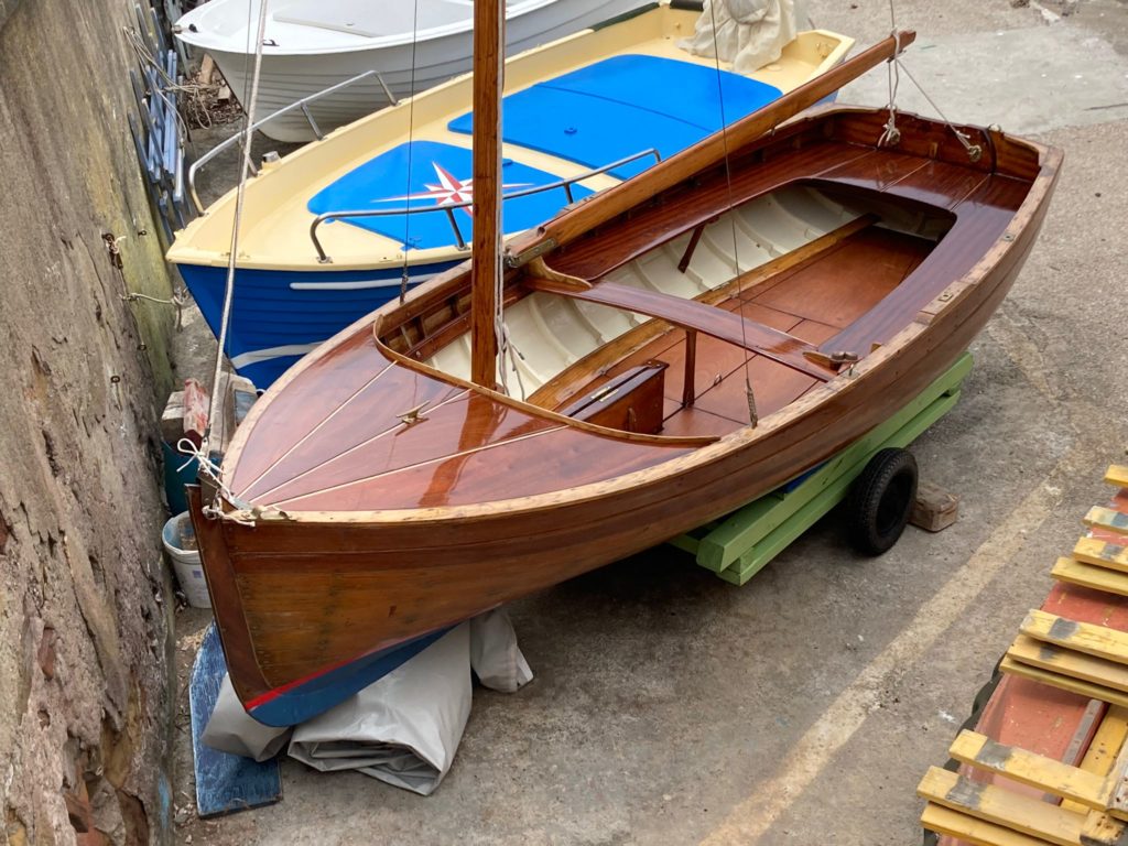 14 feet wooden sailing boat, in mahogany (cedar for the hul) dated 1958 and restored as brand new.Working sailing and rowboat produced by historic company Garfagnoli in Lighor, Italy, discontinued in 1970.