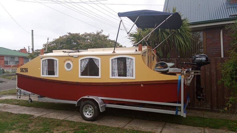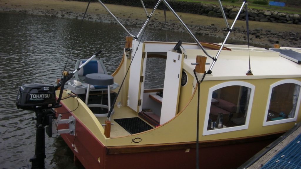 It has a 12v LiFePo battery and 220W solar panel for lights and charging sockets.. The only major changes to the plans were to raise the cabin top by 6″, build a slightly different rear sliding hatch (but keeping the front hinged hatched) and adding an outboard. We have no canals here in Tasmania, but many rivers to which my MV Nutshell can be towed.