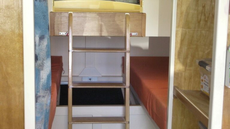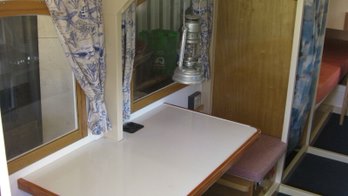 There is a small gas cooker using disposable propane bottles, a cooler box and and electric submersible water pump in a plastic jerry for the sink. The outboard fuel tank is housed in a plastic crate on which is fitted a swivel “captain’s” seat to save space. A bimini was modified to fold forward and be secured for towing but provides good shelter for the cockpit when opened. She cruises at 5 knots but is very noisy in a chop and can be a handful when the wind picks up!