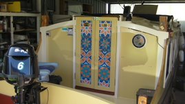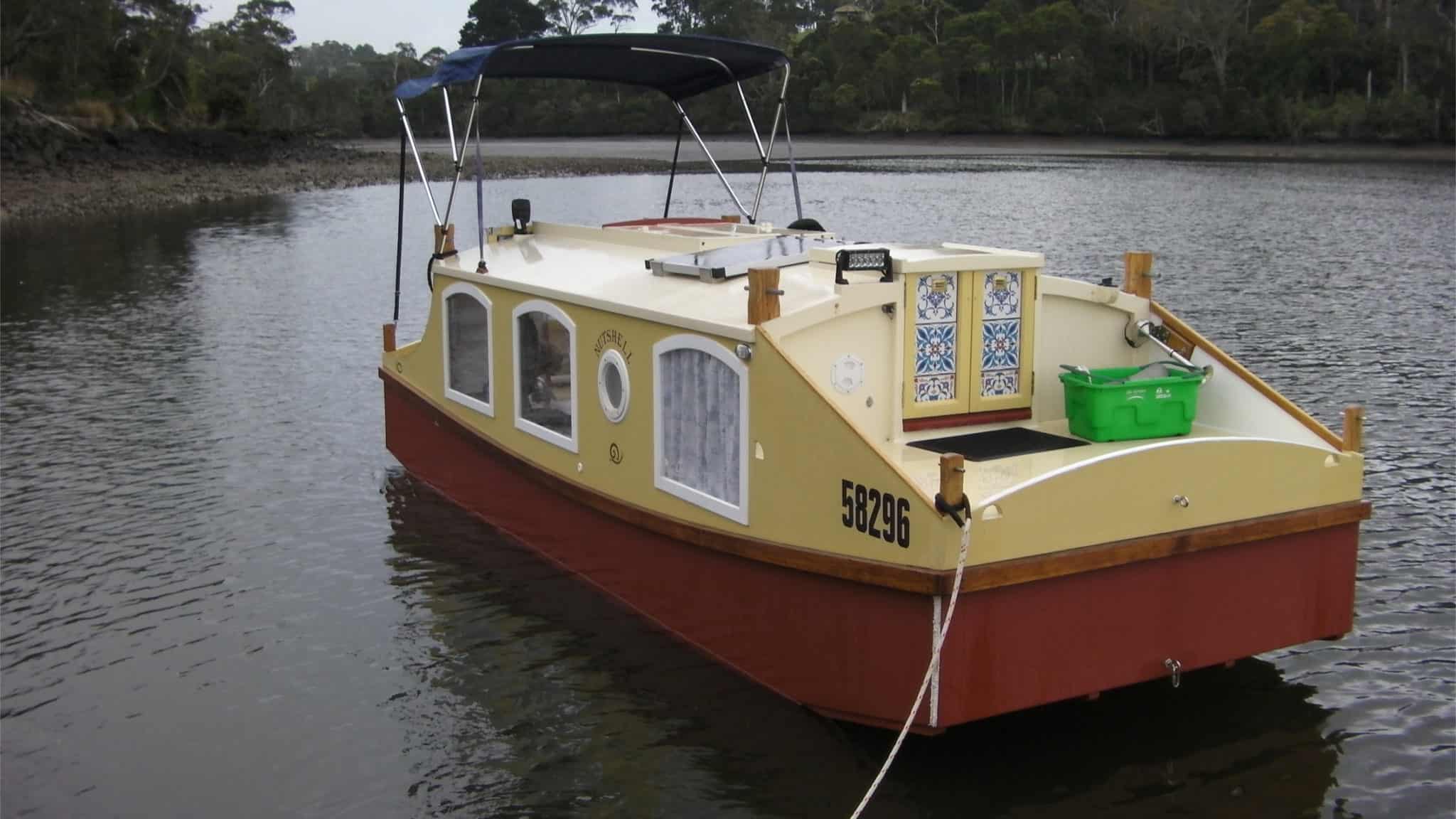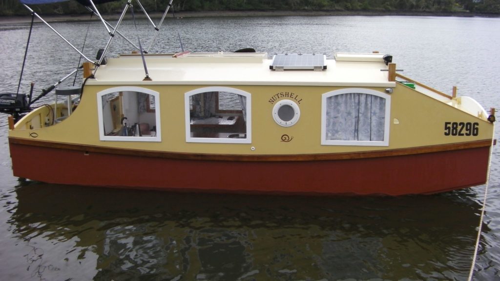 Nutshell is a small, trailerable canal boat. Based on the Escargot design, it sleeps three, with a smally galley and porta-potti enclosure. The Escargot canal boat filled all my requirements for a small, low-powered trailer boat. Falling into the “Shantyboat” category, many have been built very cheaply and quickly. However, once I started the project I was consumed by a desire to make nice, neat joins and clean finishes so she took about 800 hours over one year to complete.Built to a low budget, used Oregon scaffold planks were used for the frames (so some nails, holes and splits had to be avoided) with 1/2″, 3/8″ and 1/4″ marine plywood.
