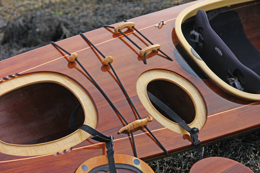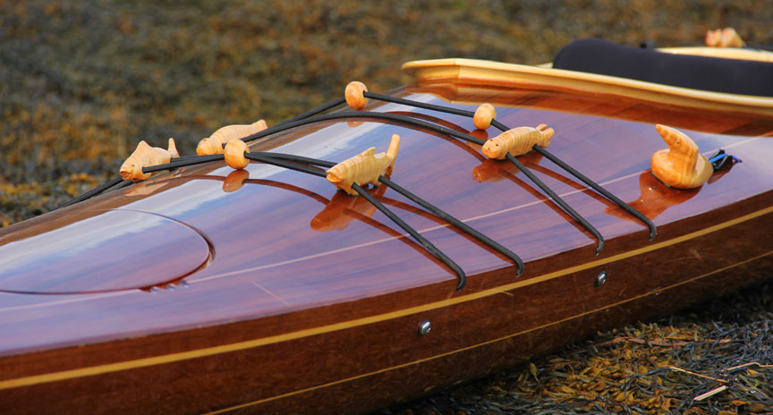 Hatch covers are held tight with attracting pairs of rare earth magnets for a waterproof seal. Carved effigies of salmon, seals and sea mammals create adjustment bars for the shock cord hold downs on the deck. This and the “goose egg” handles on the stem ends reflect a more traditional outfitting style.Already a member? Log in herePhotos