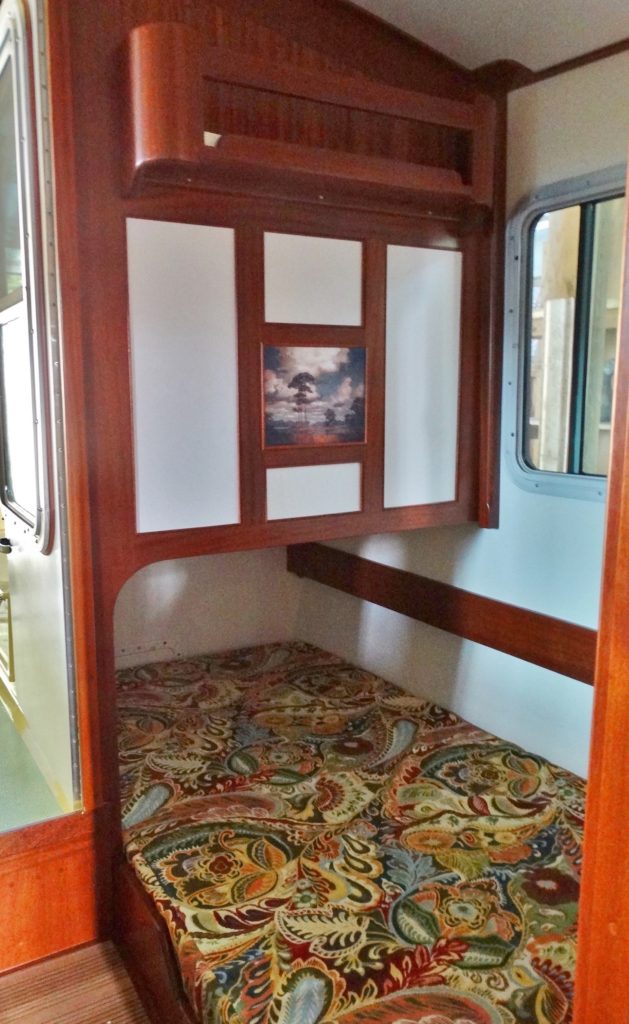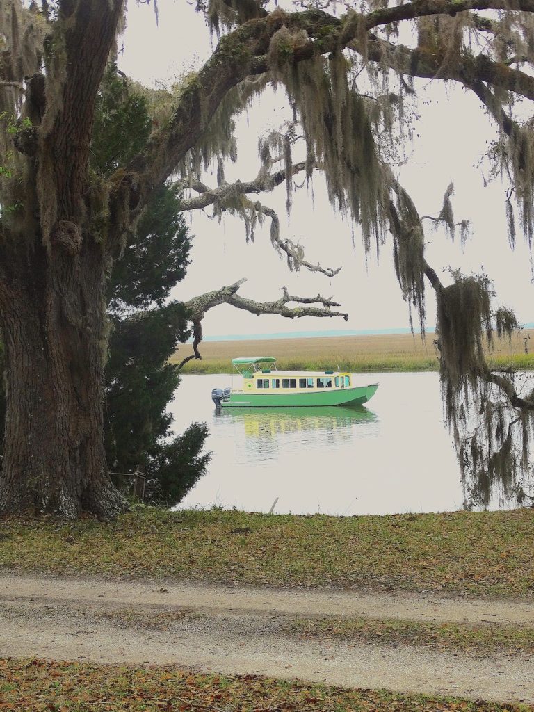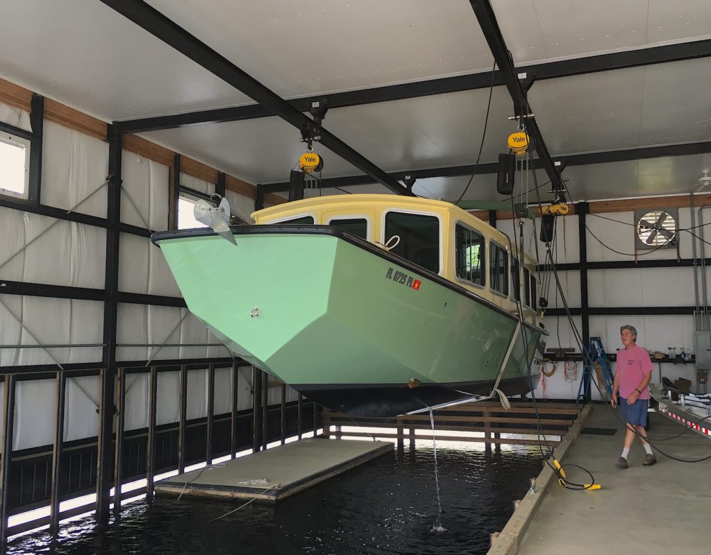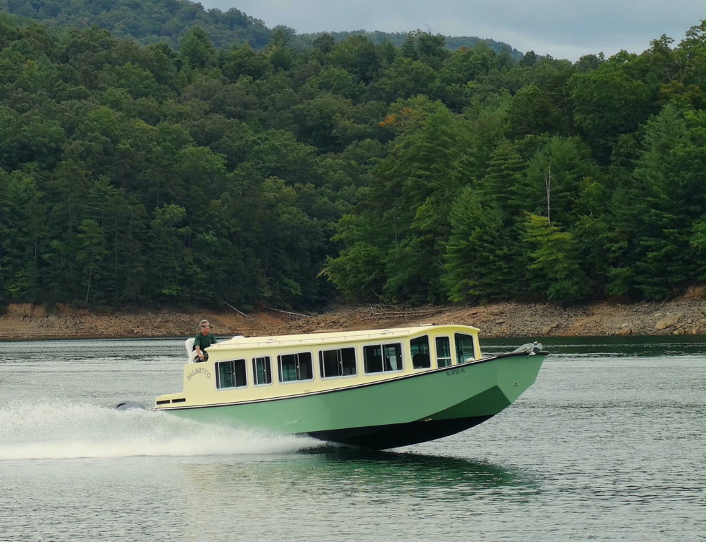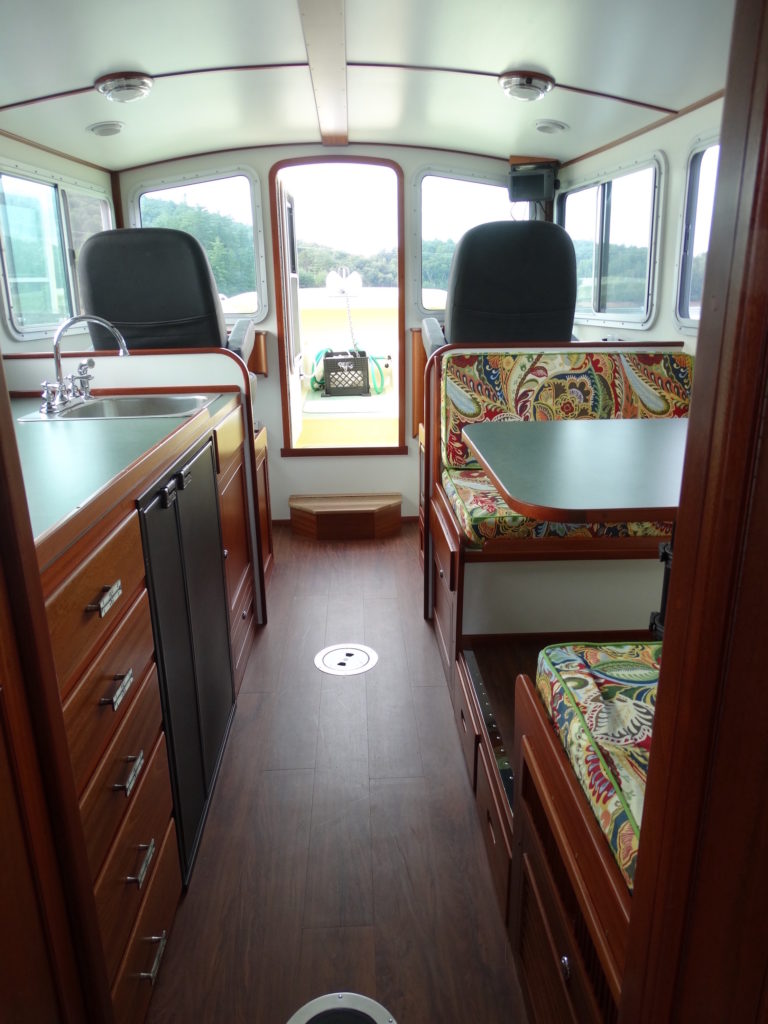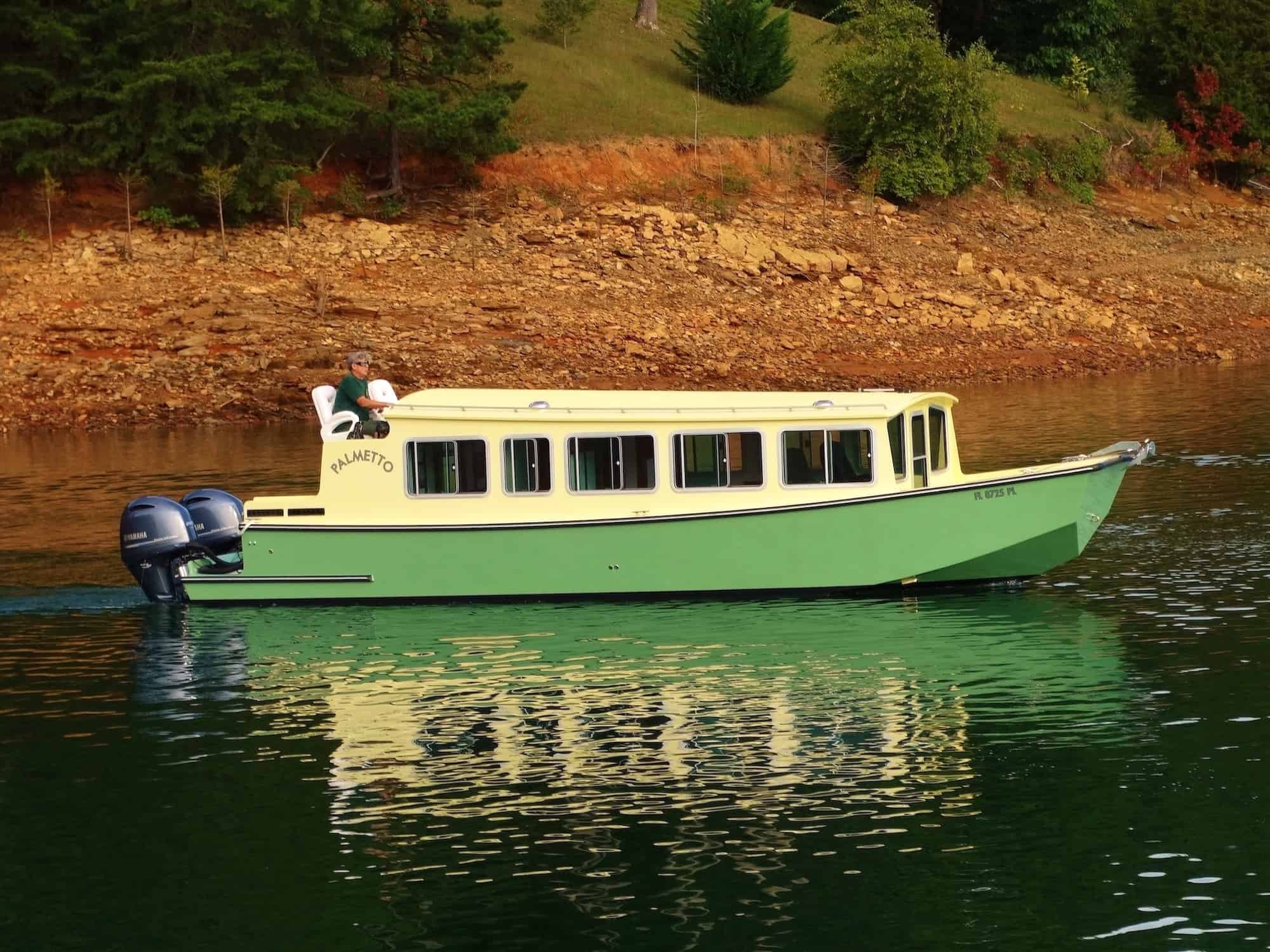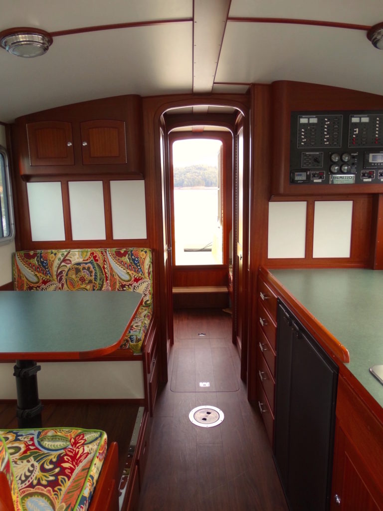 Palmetto was built for cruising in very shallow waters, with complete and comfortable accommodations for two. She has two full sized bunks, an enclosed head with a separate shower. Forward of that is a complete galley to port and a traditional dinette to starboard. The inside steering station has two captain’s chairs. From this area you can step into a forward cockpit that makes anchoring and line handling very easy. Aft of the cabin there is an outside, elevated steering station that gives you great visibility. There are two bench seats aft of this, one of which contains a 5-KW diesel generator. The boat has a top speed of 40 mph and cruises nicely at 30. She also rides well at 9mph. Drawing 18″ of water opens up many new cruising teritories in the south-eastern United States.