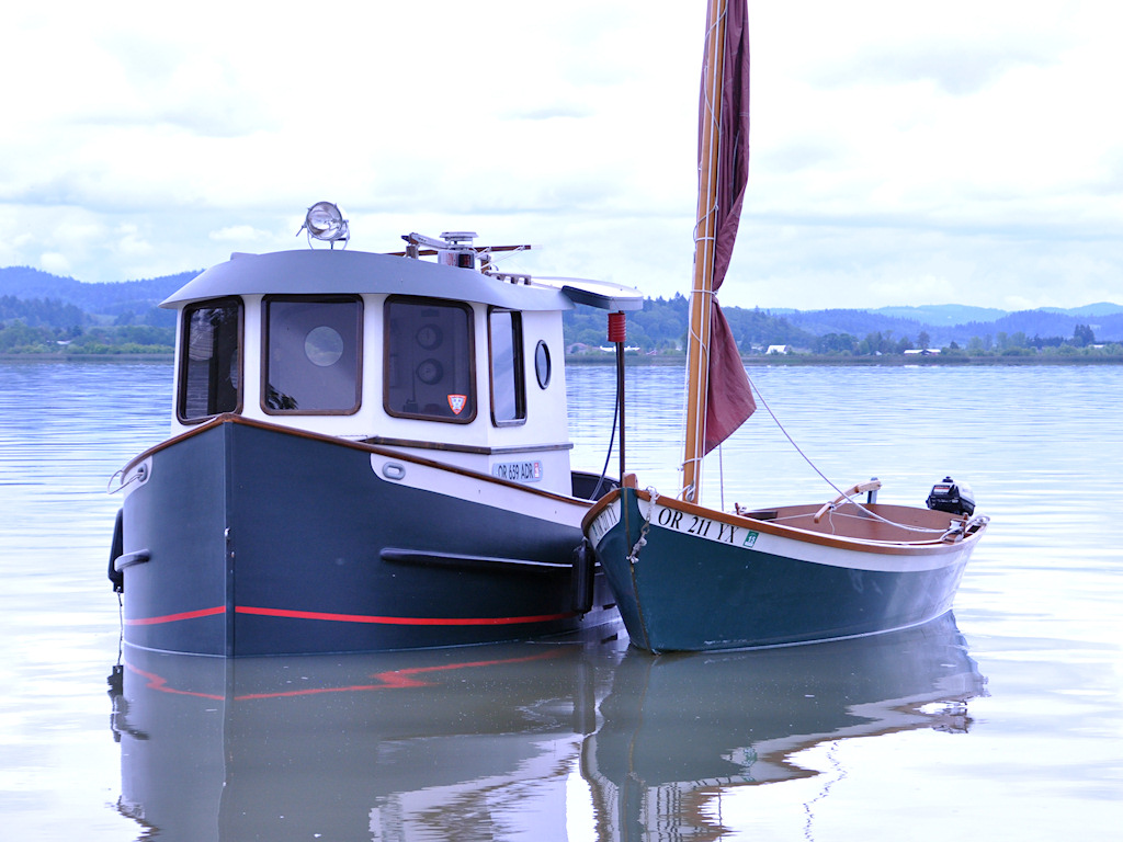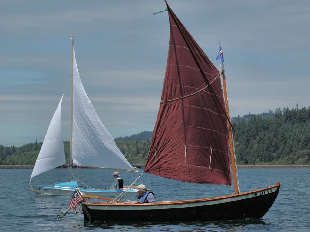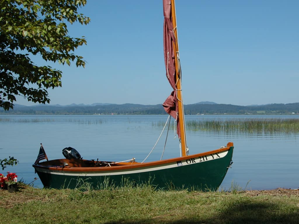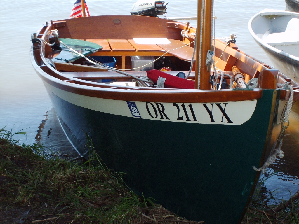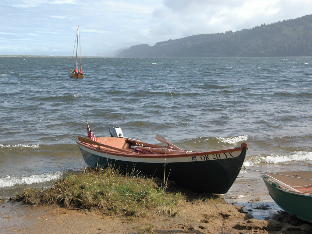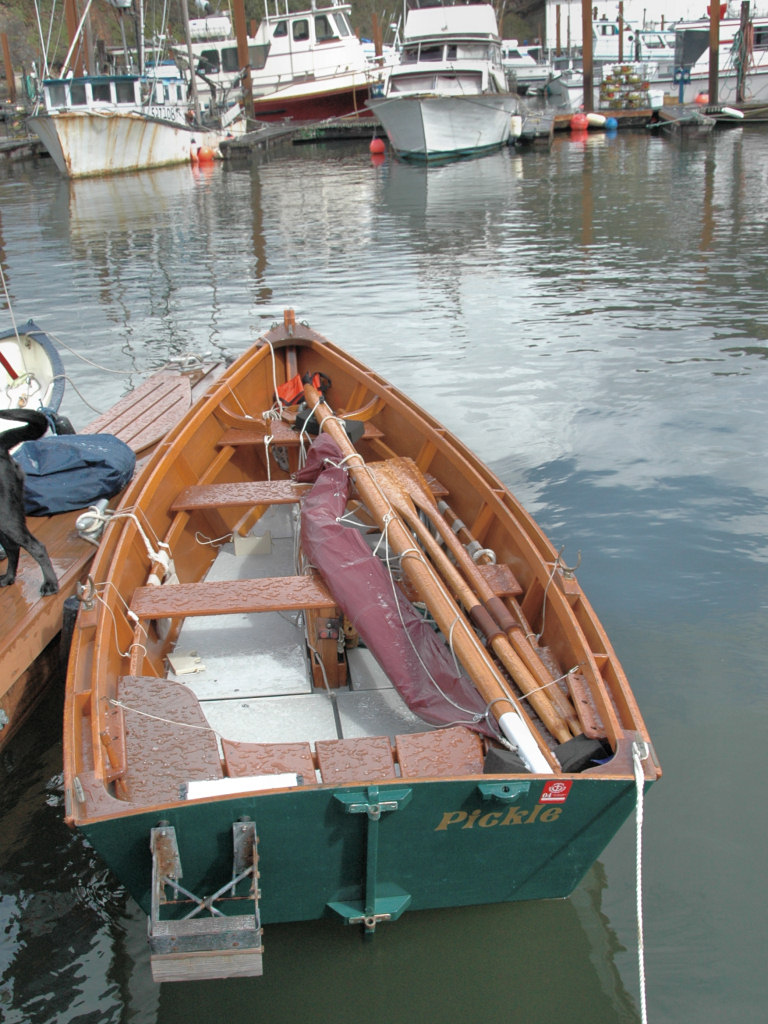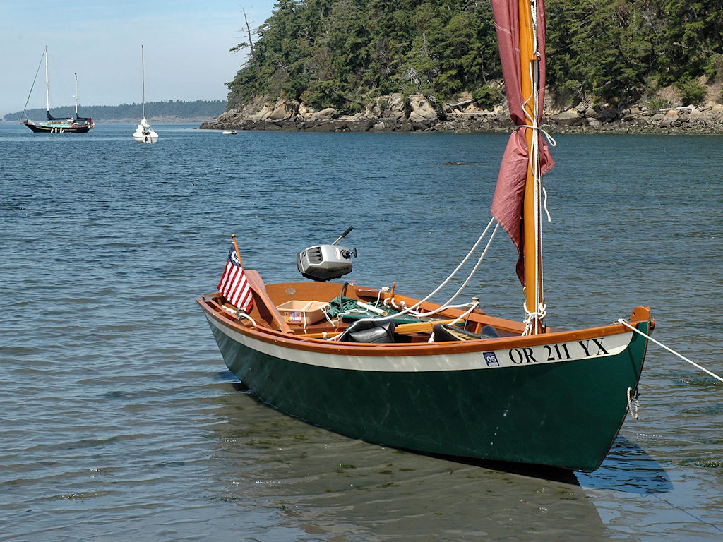 Pickle is a Footloose Skiff, designed by ex-fisherman Warren Jordan, of South Beach, Oregon, for use on the bays and lakes of the Oregon Coast. She’s fat and stable, with a small sail, because it’s often windy on a “nice day” on the Coast, and Warren got enough excitement while commercial fishing.You can learn more at jordanwoodboats.com/product/footloose/