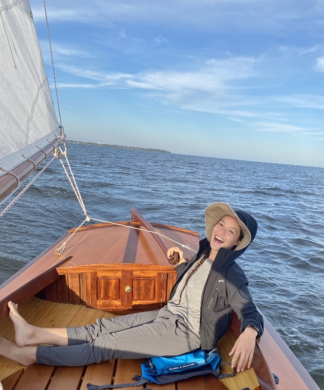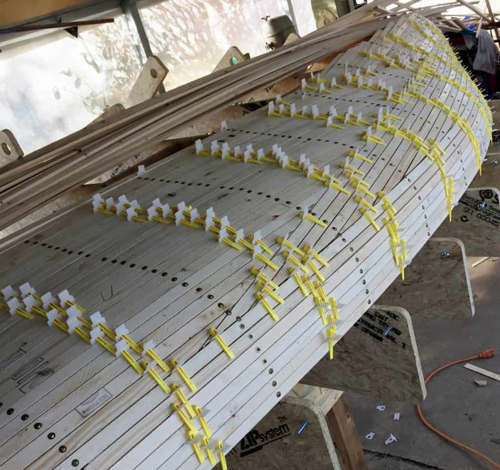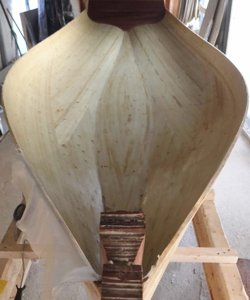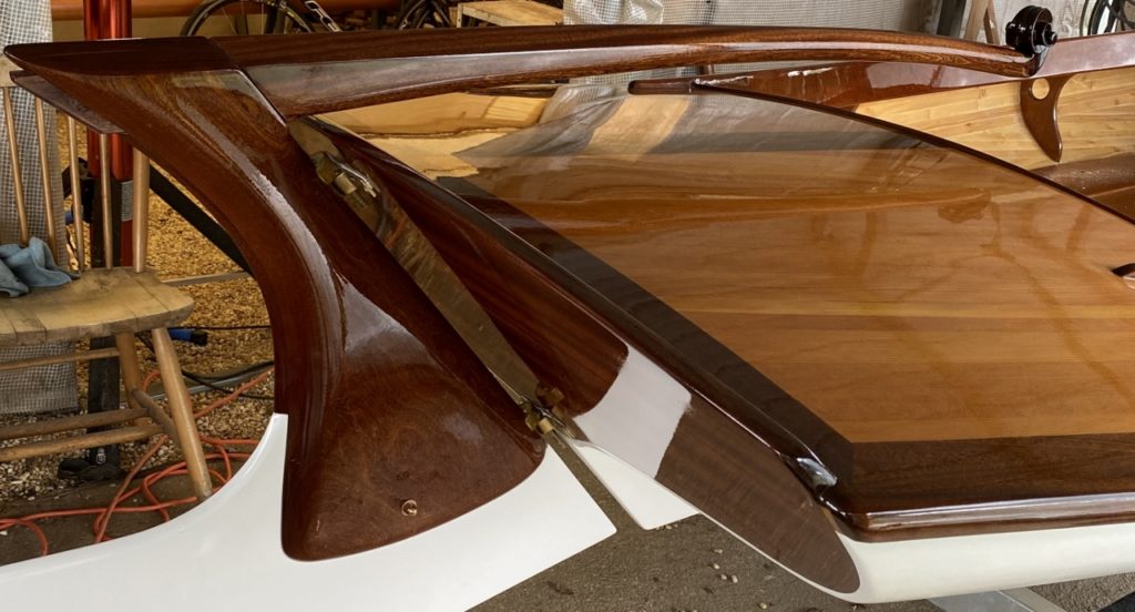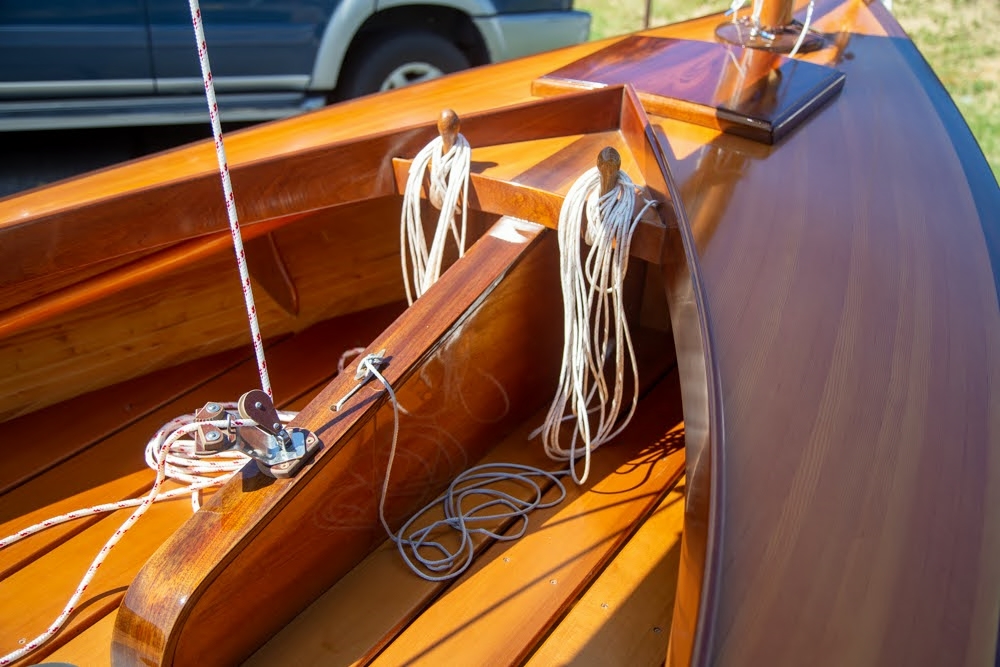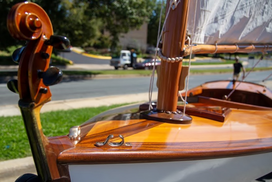 The Melonseed is a well-known 16’ dinghy originally designed and built in the 1890s. I bought the plans drawn by Marc Bartow and spent several months (I’m retired) learning how to draw using Rhino3D. I drew and faired the boat on the computer using Marc’s plan then pulled all the parts off the drawings and cut them on a CNC. Though the lines seemed just right I wanted more of an hourglass transom and Rhino has a tool that allows you to push and pull shapes so I squeezed the transom to get the shape I wanted. The mast and spars are hollow making it easy to step the mast. I strip planked the hull with big-box 2X4 lumber ripped to 3/8″x 1″ leaving a 1/16″ gap between each and filling the gap with thickened epoxy. I used a larger sail plan from a Melonseed designed by John Bradly. The decks are quarter-sawn Douglas Fir and trimmed with Sapele. The fiddle headstock on the stem was hanging around the shop for a few years and just seemed the right spot for it. A joy to sail but it’s a wet and exhilarating ride if it’s blowing over 15 to 20Already a member? Log in herePhotos
