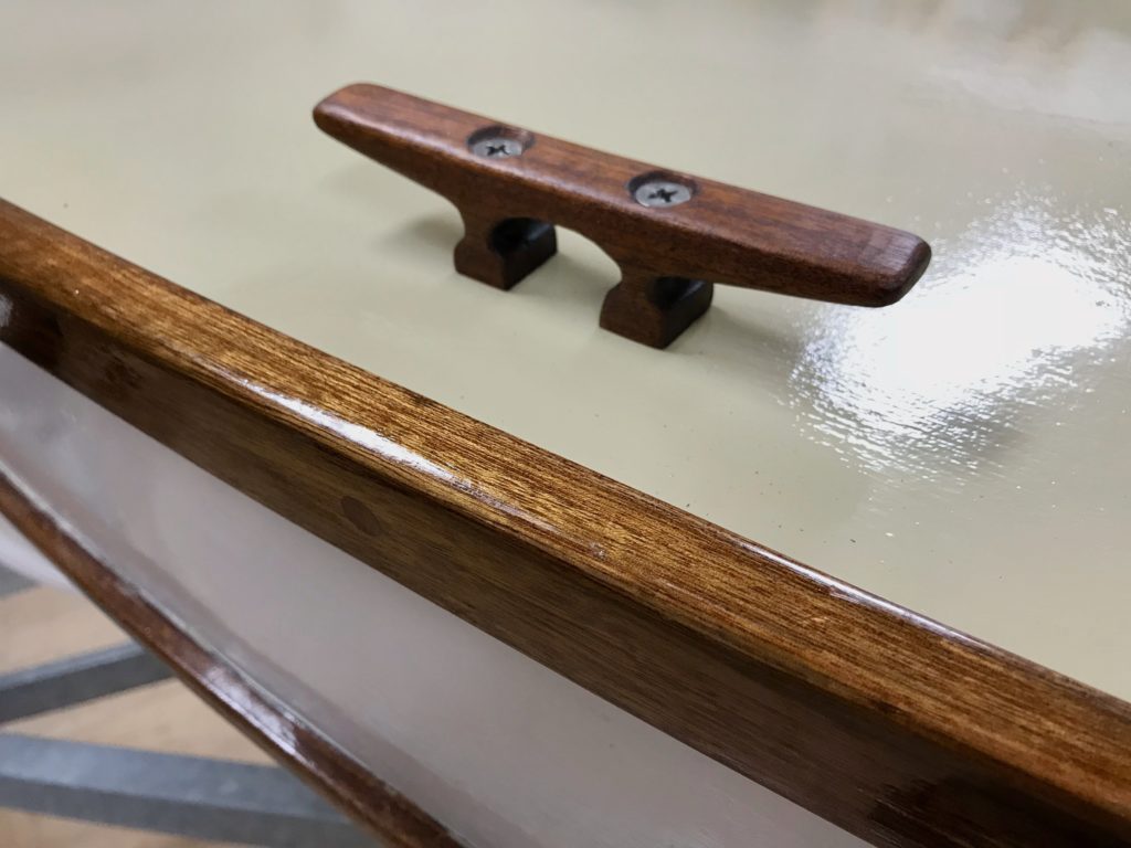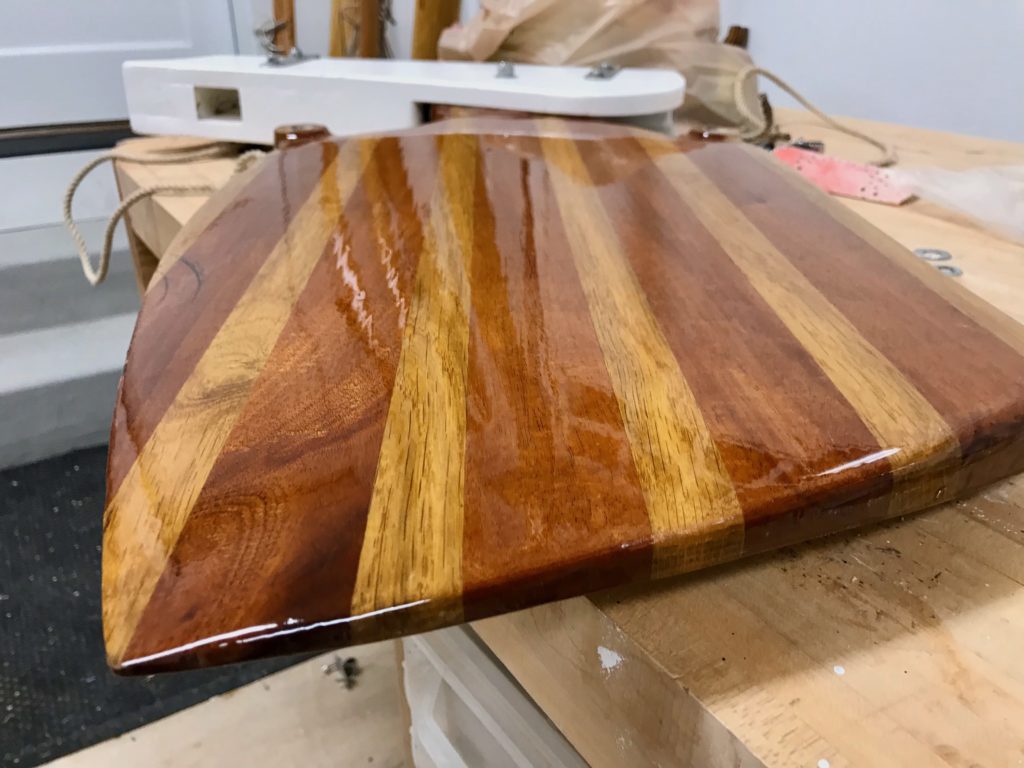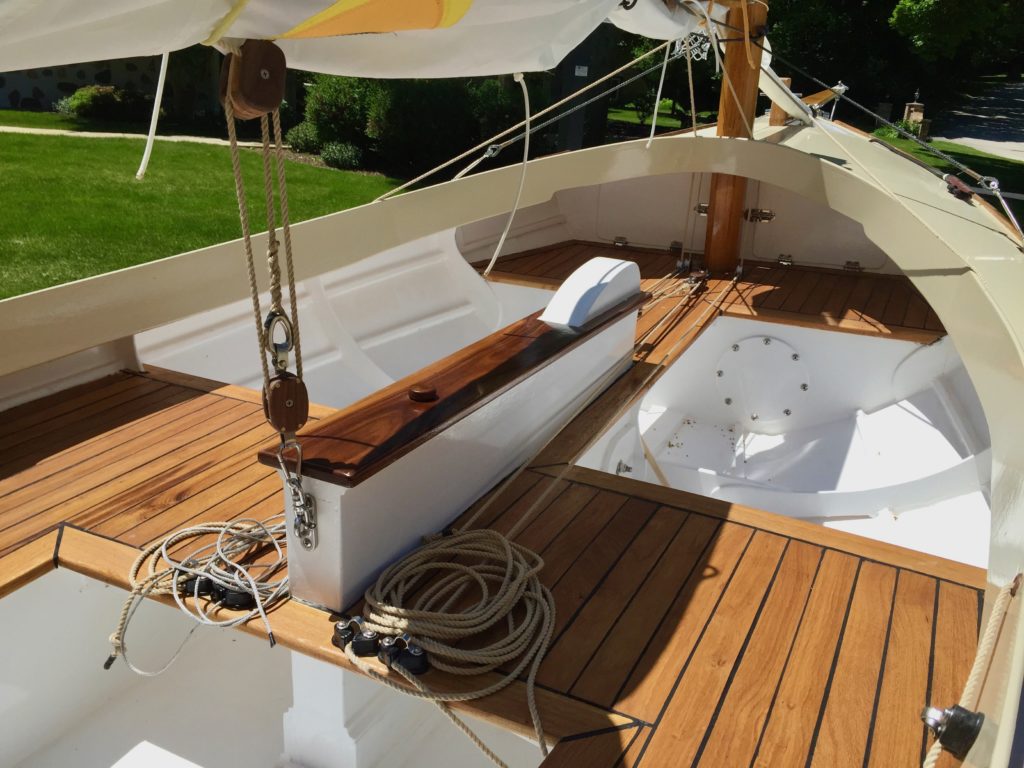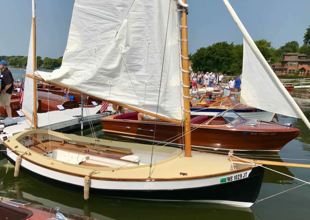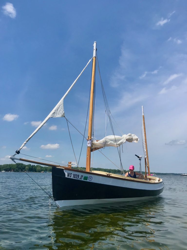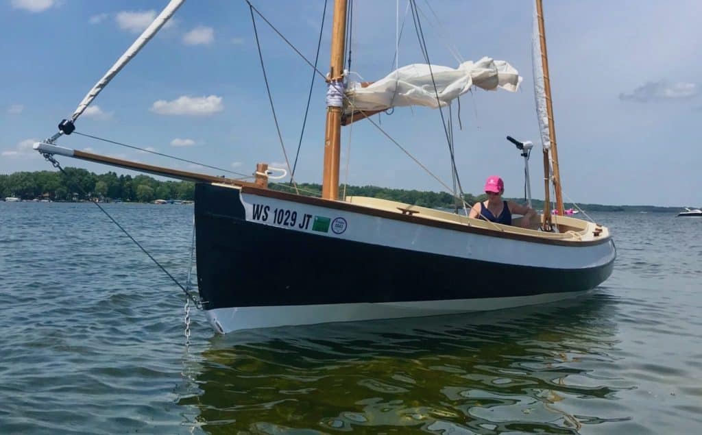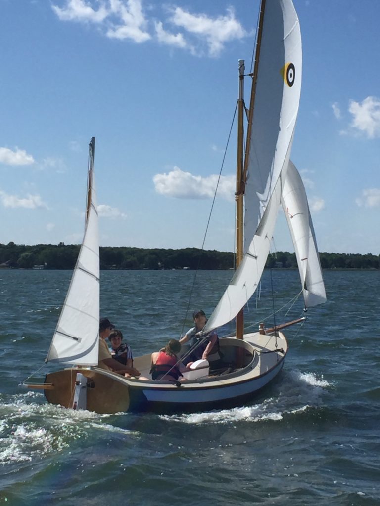 Puffin is a scratch-built John Welsford Navigator. It’s the second boat I ever built. The first was a kit from CLC. I had no tools and, with the exception of the CLC kit, almost no woodworking experience prior to building this boat. It has a hinged hollow birdsmouth main mast. All the blocks and tackle are hand made with elm cheeks and lignum vitae sheaves. The rigging is all 3-strand New England Ropes traditional look and is hand-spliced and served. The decks are hand-laid white oak. The sails were sewn by me on my daughter’s $100 singer Fashionista sewing machine. I designed and sewed the asymmetrical spinnaker to represent the flag of the city of Milwaukee. Her color scheme is black, white, and buff, and was inspired by a trip to the Atlantic Puffin colonies in Iceland. She’s a dry and nimble little craft that I use mostly on Lake Michigan and the surrounding inland lakes.Already a member? Log in herePhotos