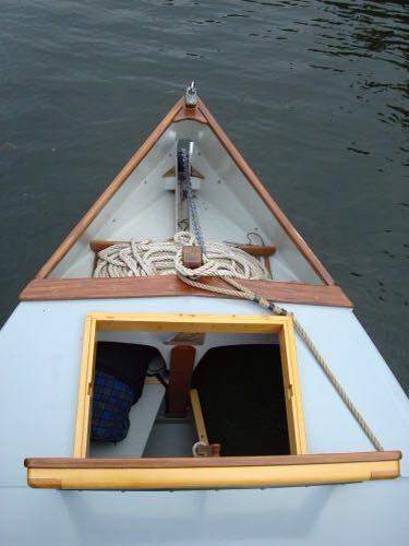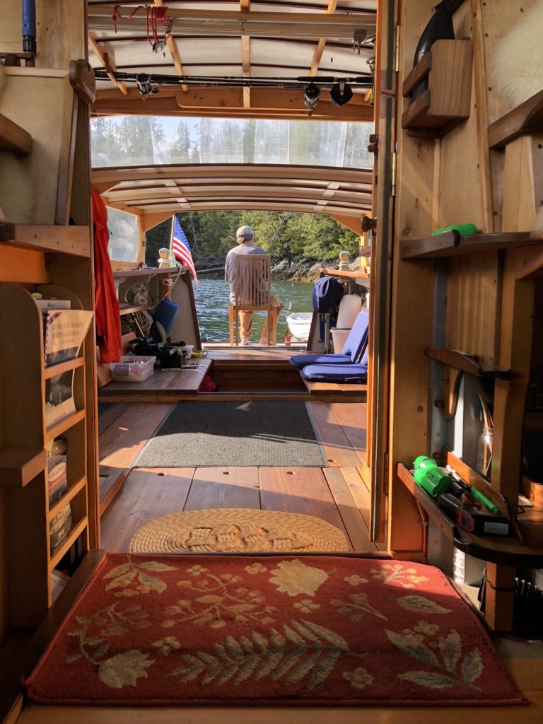 Raven’s deceptively simple design hides the fact that many of her spaces and shaped wooden doo-dads have multiple purposes. For example, her fish-cleaning station converts into a bar. Her back deck is great for dinghy stowage until it becomes a lounging and dining area for six. Her tailgate becomes a launch ramp, then a private fishing dock, then a sunbathing-and-cocktails deck. Down below, bunks convert to settees and tables, and tables convert to workspaces with storage underneath. There are multiple configurations for the wheelhouse to accommodate tall and short people. Leif Knutsen, co-founder of Port Townsend’s Shipwright’s Co-op, designed her to make things easy to disassemble and take home for refinishing in your garage, if desired.