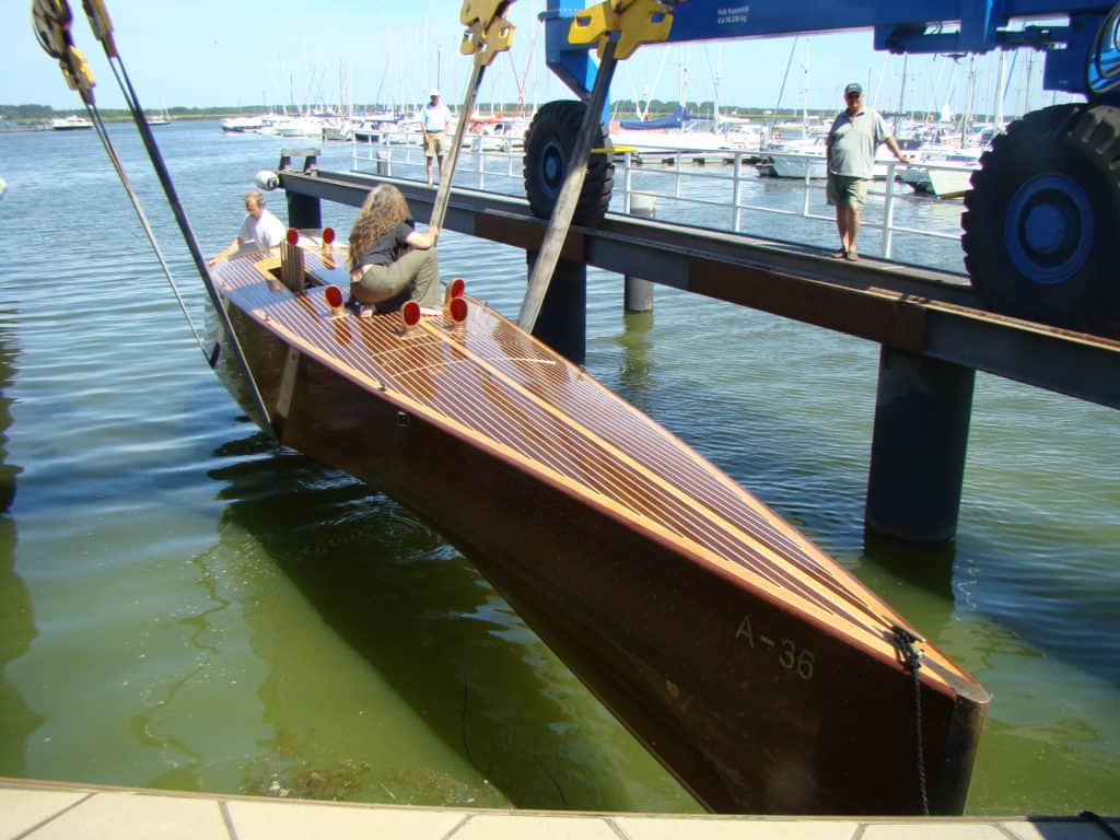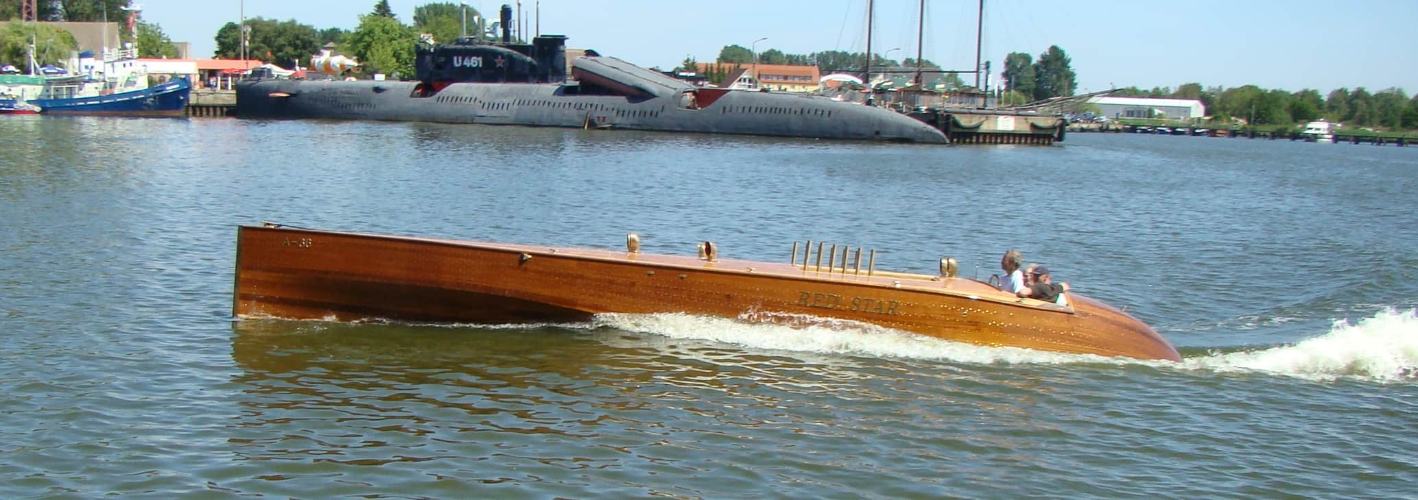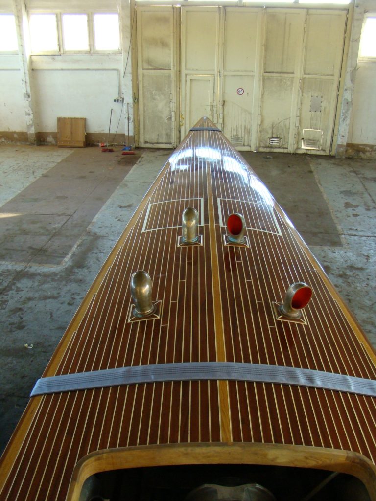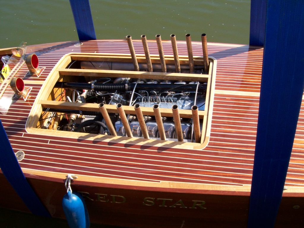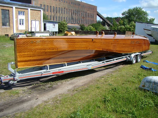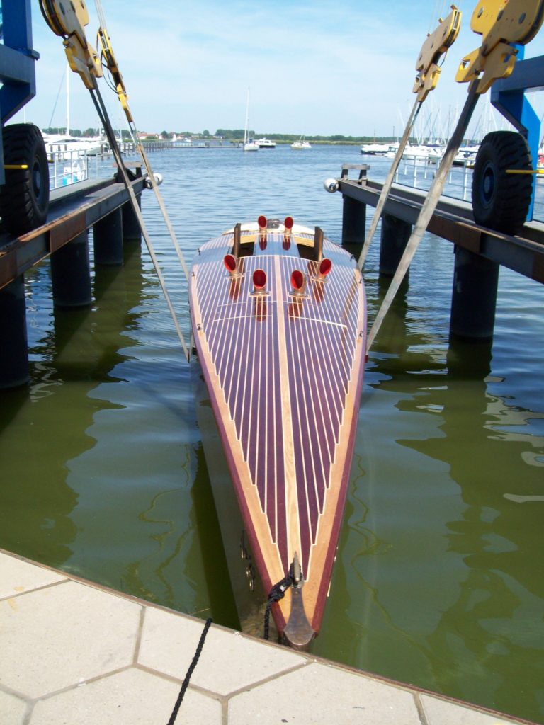 Gentleman Racer, 12 meter long, 2 meter beam, Propulsion 12 cylinder TATRA Diesel Engine, 19.000 cubic centimeters, 500 horsepower, supercavitating propeller, 40 knots +, made from mahagony planks on oak frames, more than 6000 bronce screws for fastening, seats 3 persons after of the open engine bay and the twelve open exhaust stacks. Designed in house, following the early 1920 raceboats.Already a member? Log in herePhotos