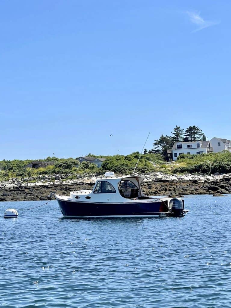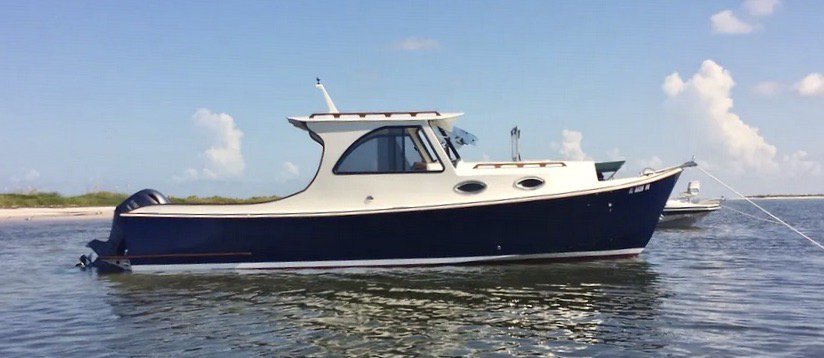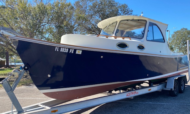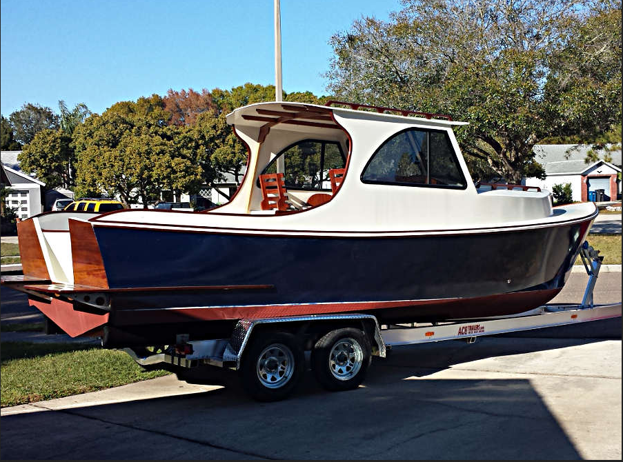 This baby picnic boat is a homemade, cold molded Berry Point 26 designed by Tad Roberts, who was a naval artchitect on the Hinckley Picnic Boat. It was built over the course of 4 years by Jeff Lapratt in Florida. I had it hauled to my home port of Portsmouth, NH in Jan. 2021. The Berry Point 26 was designed to fulfill a need for a traditionally stylish, trailerable, moderately fast and capable family cruiser. She had to be shallow draft, economical to operate and simple enough for the experienced home builder or small yard to take on. These criteria originated in a discussion on the WoodenBoat design forum concerning the ideal small powerboat. Numerous hull forms were suggested and discarded as being better at one speed or sea state but to/ systo deep or slow or not economical, or just ugly.