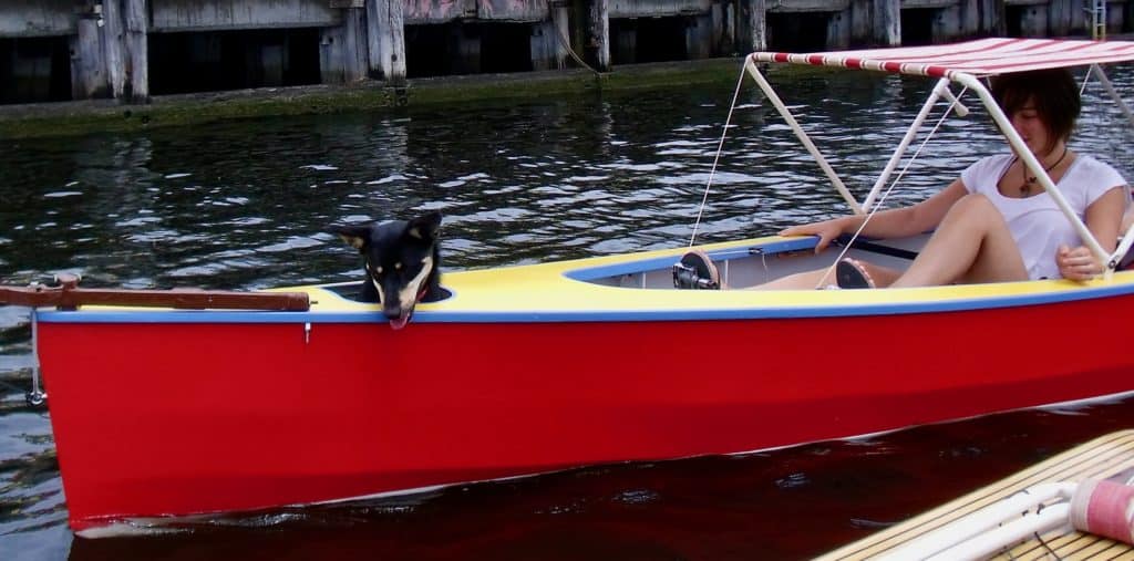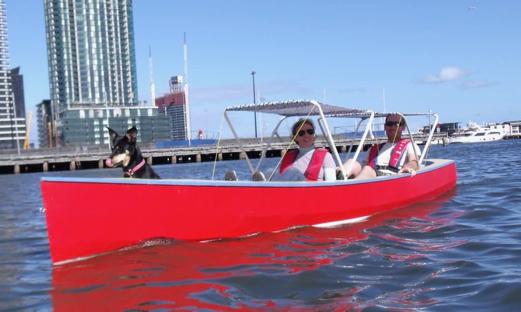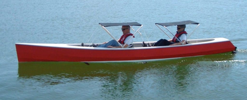 Human powered 19′, 2 place boat using Hobie Mirage drives.I was astounded by the thrust I could generate with a Hobie Mirage drive. A dual place Mirage drive Hobie kayak can easily exceed hull speed. I found Chris Ostlind who had experience with the drives and ask him to design a stitch & glue hull specifically for Mirage propulsion. “Ripple” is the result. We can maintain 8.2kph for 2 hours while sitting back in the shade with hands free.