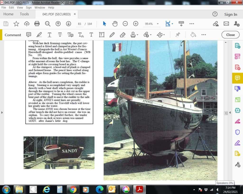 Owner’s Description Willow Leaf Pram The story begins in the image below from Woodenboat #41 p 81 and continues here : https://duckworks.com/portage-pram-plans-rowing-version/ Sancho is now 36 years old and still going strong as tender to Evangeline..our Rozinante . Already a member? Log in here Photos Map No Records FoundSorry, no records were found. Please adjust your search criteria and try again. Google Map Not LoadedSorry, unable to load Google Maps API. Driving Walking Bicycling Public Transport Miles Kilometers Comments Previous Next