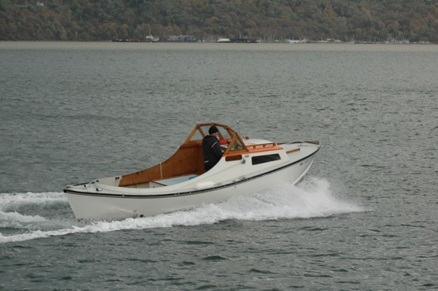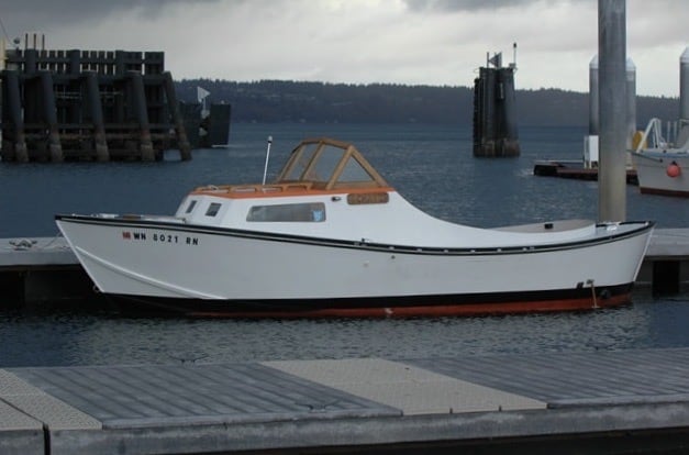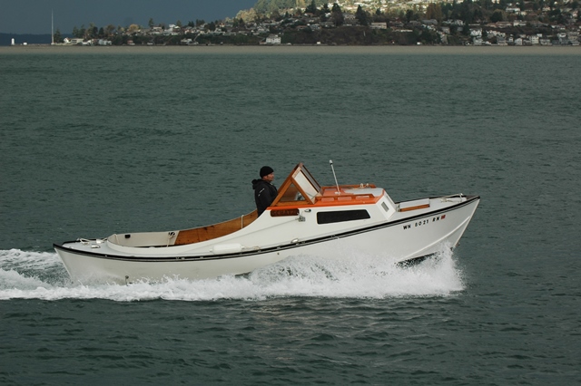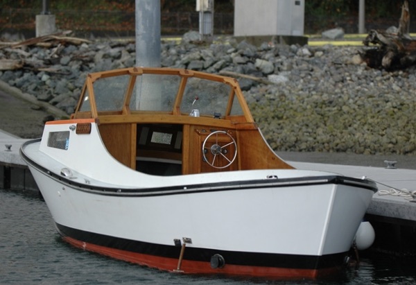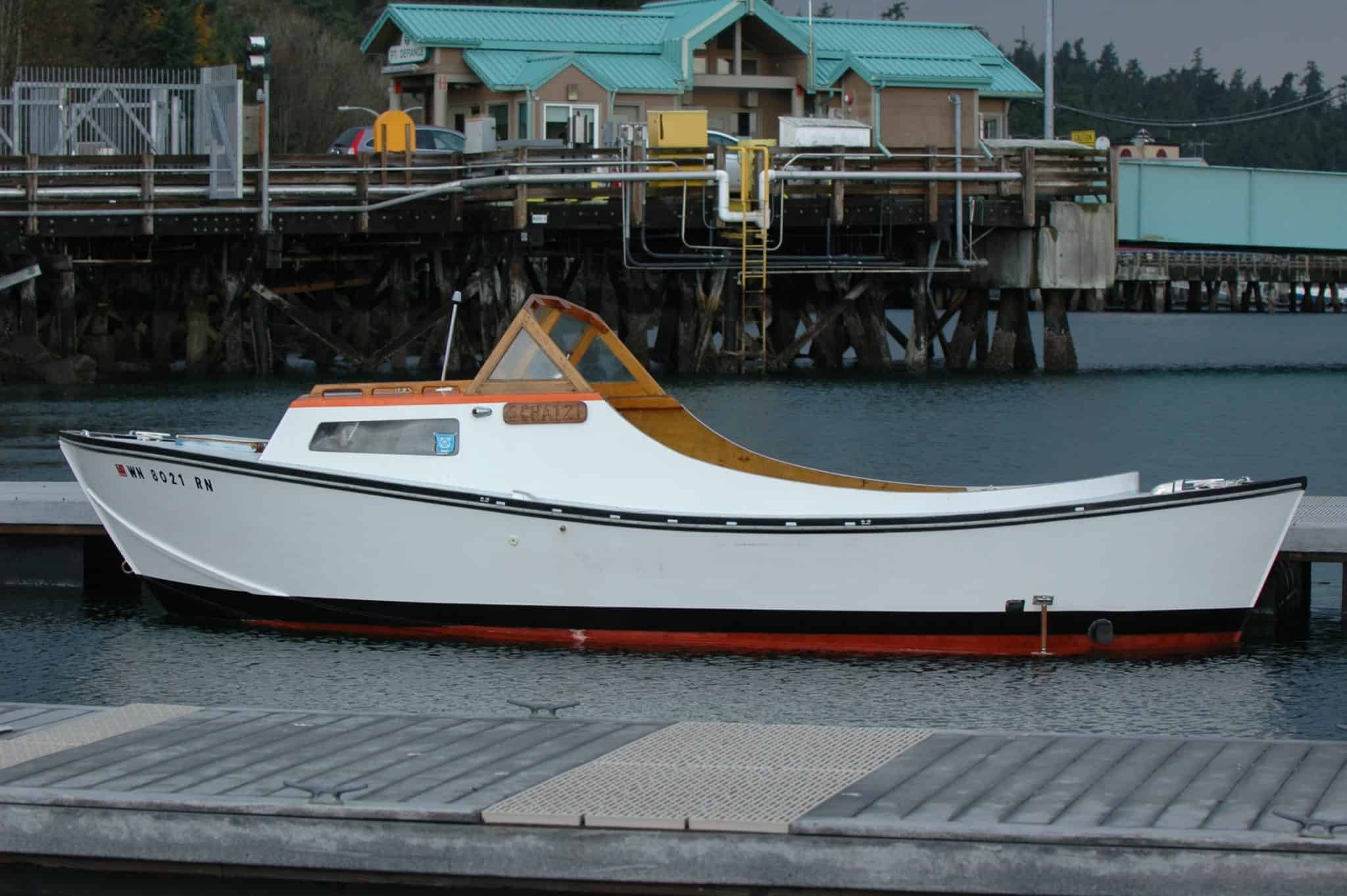 Schatzi is a 22′ Bartender built true to George Calkins’ sea-worthy, double-end, planing design. She was built by a German merchant marine living in California. Her name means “Little Darling” which she truely is. She has wonderful, sweeping lines and proportions. Built from marine plywood and mahogany frames, and powered by a Chrysler 318 V8, she can do well over 30 knots. After 45 years and 5 owners, she is still going strong.Already a member? Log in herePhotos