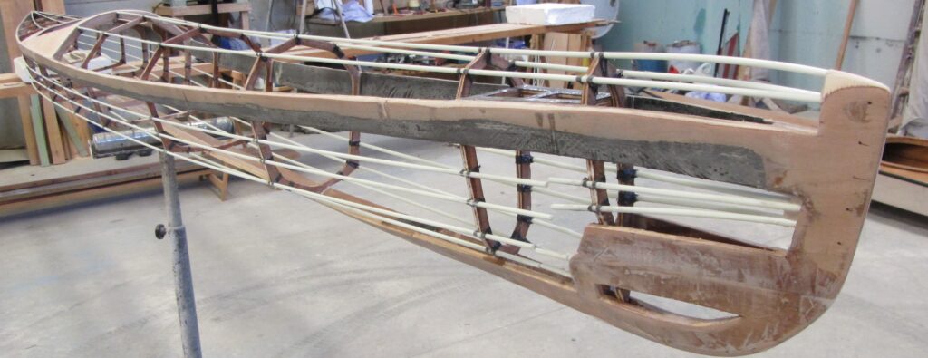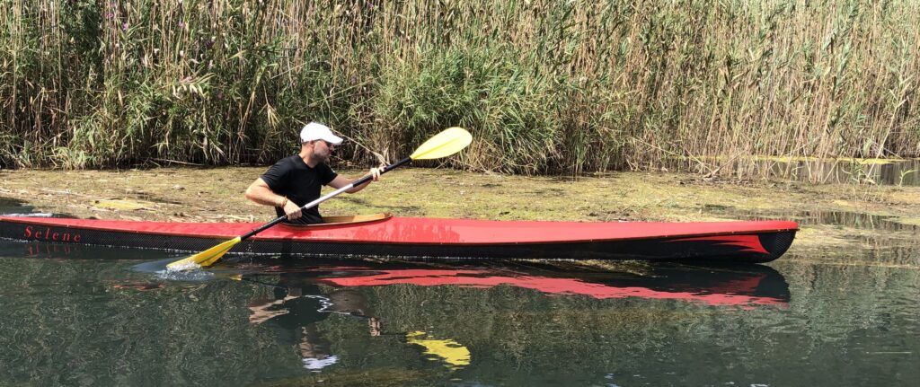 SELENE; Kayak con estructura de madera de okume, casco de fibra de carbono y cubierta de piel sintética cosida a mano. Eslora de 550cm, manga 50,5cm, peso 18,5 kg.Enlace a mas fotos y presentación en inglés: