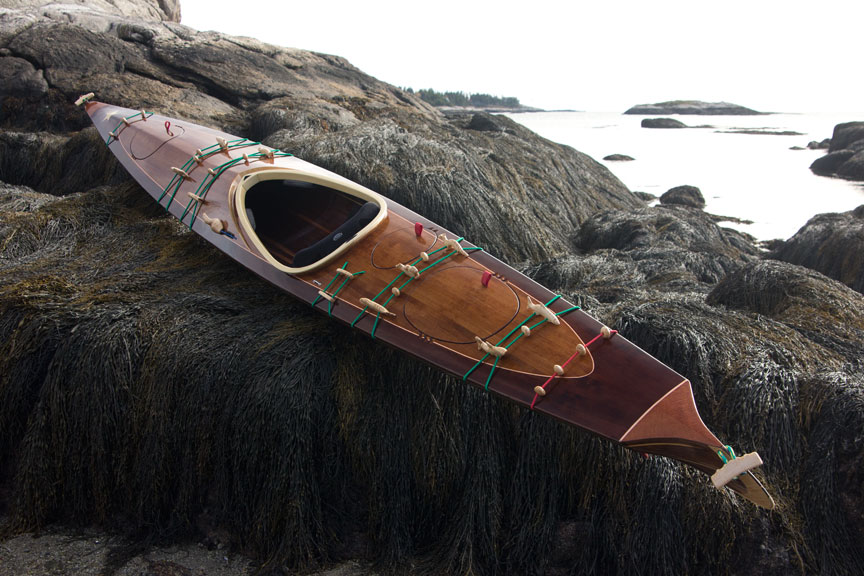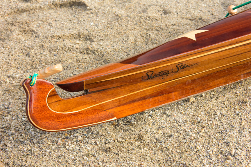Shooting Star is a Wood Strip sea kayak based on Aleut baidarka indigenous skin and frame kayaks of the Aleutian Islands. I’m the first to make a hard shell version of this outstandingly seaworthy kayak design. This design excels in strong winds, huge seas and surfing waves. While I installed a retractable skeg on this baidarka, I find it has little to no effect. The baidarka design (without skeg) handles wind and waves without effort.