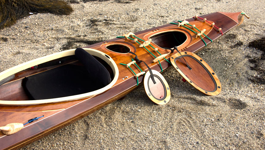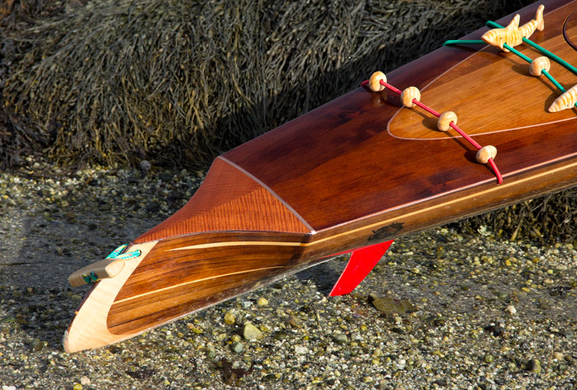 Hatch covers are held tight with attracting pairs of rare earth magnets for a waterproof seal. Carved effigies of salmon, seals and sea mammals create adjustment bars for the shock cord hold downs on the deck. This reflects a more traditional outfitting style.