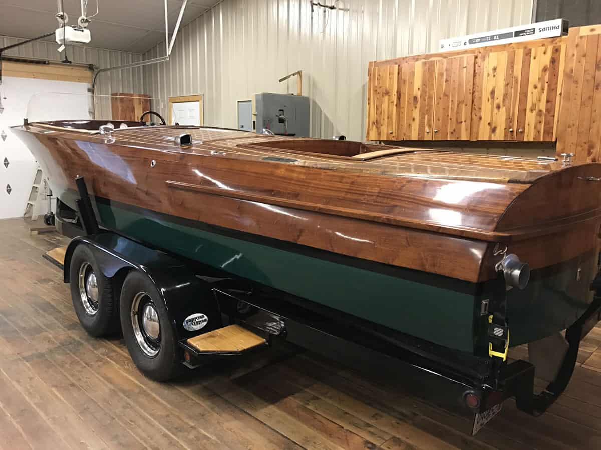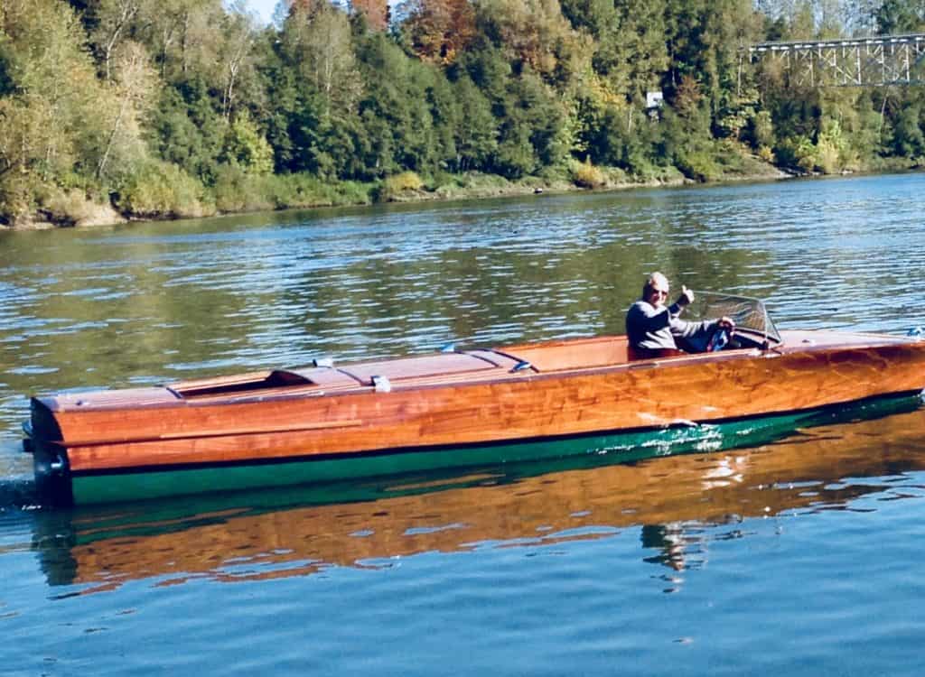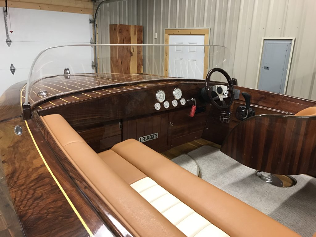 At 70 years old, I was finally able to build the boat I could only dream about in my twenties. It took 2 1/2 years to build this Mahogany framed beauty that has motor stringers made with Fir and 4 x 4 Oak used for the motor mounts. The cover boards and trim around all of the compartments are Black Walnut. The entire boat is all natural wood…no stain.