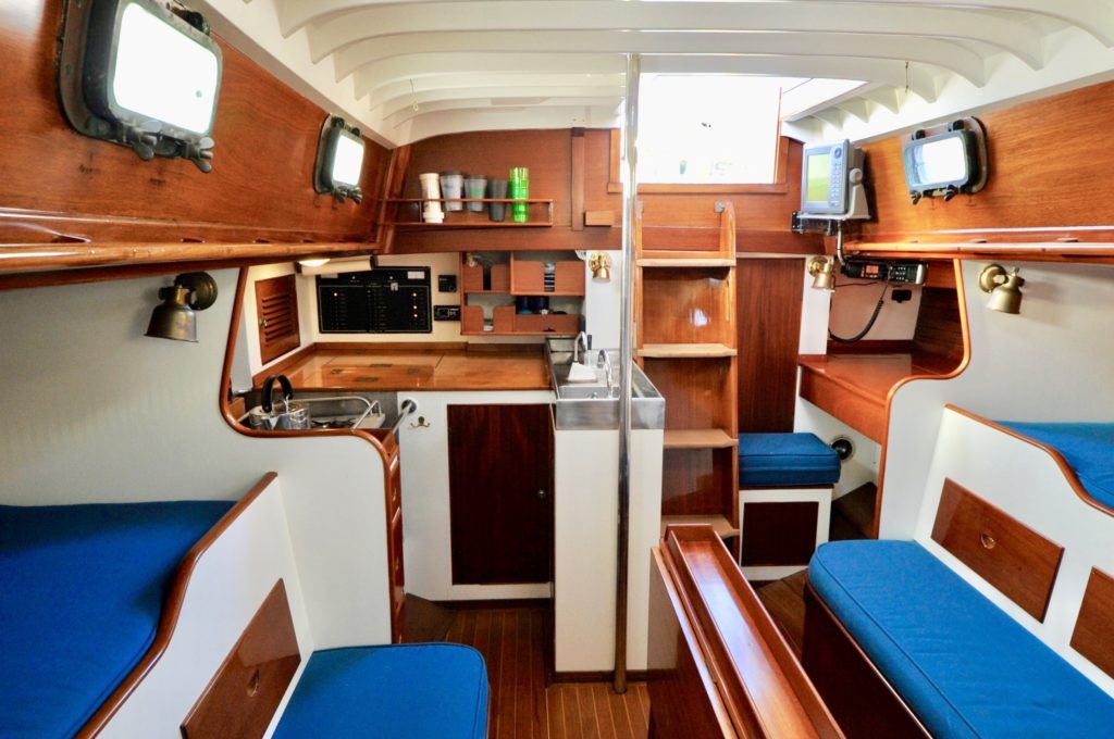 Snow Star is a transitional boat. It was built late in the CCA racing rule era. Thus a long boom, relative short rig and fore triangle. It was built for ease of handling and cruising, with greater than average tankage, horsepower and amenities.She benefited from an excellent and innovative designer who was willing to try modern (for the time) materials for her construction. She is double planked with epoxy between the planks which gives her fine and fare topsides. Her frames are laminated white oak and fastened with copper rivets. Decks are fiberglass over plywood with a two part polyurethane paint finish. There is a generous use of marine plywood throughout the boat. The aluminum mast was in the original design. The above construction techniques are evolutionary in yacht design/construction and have kept maintaining the boat reasonable.