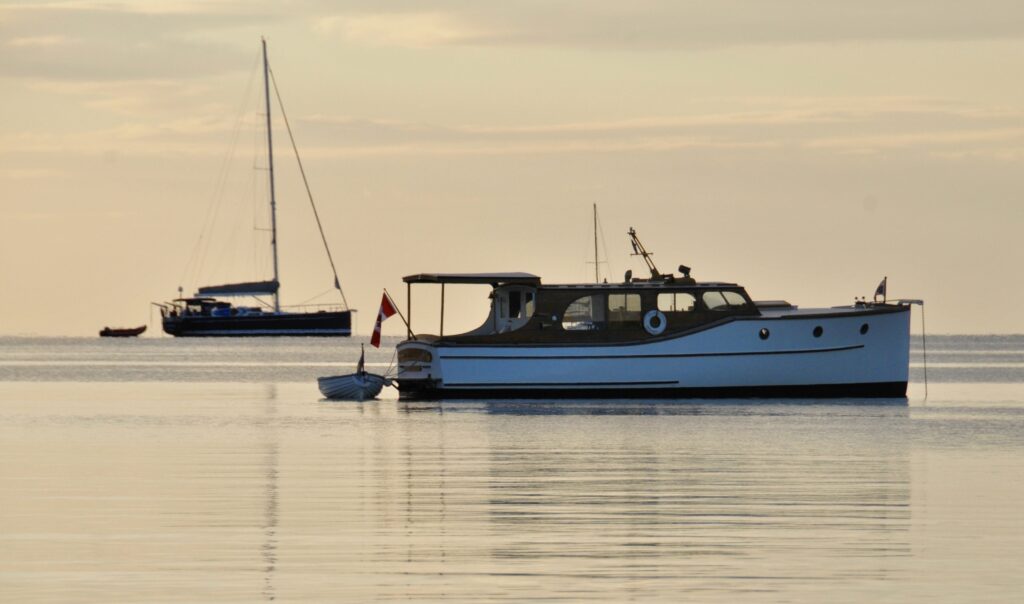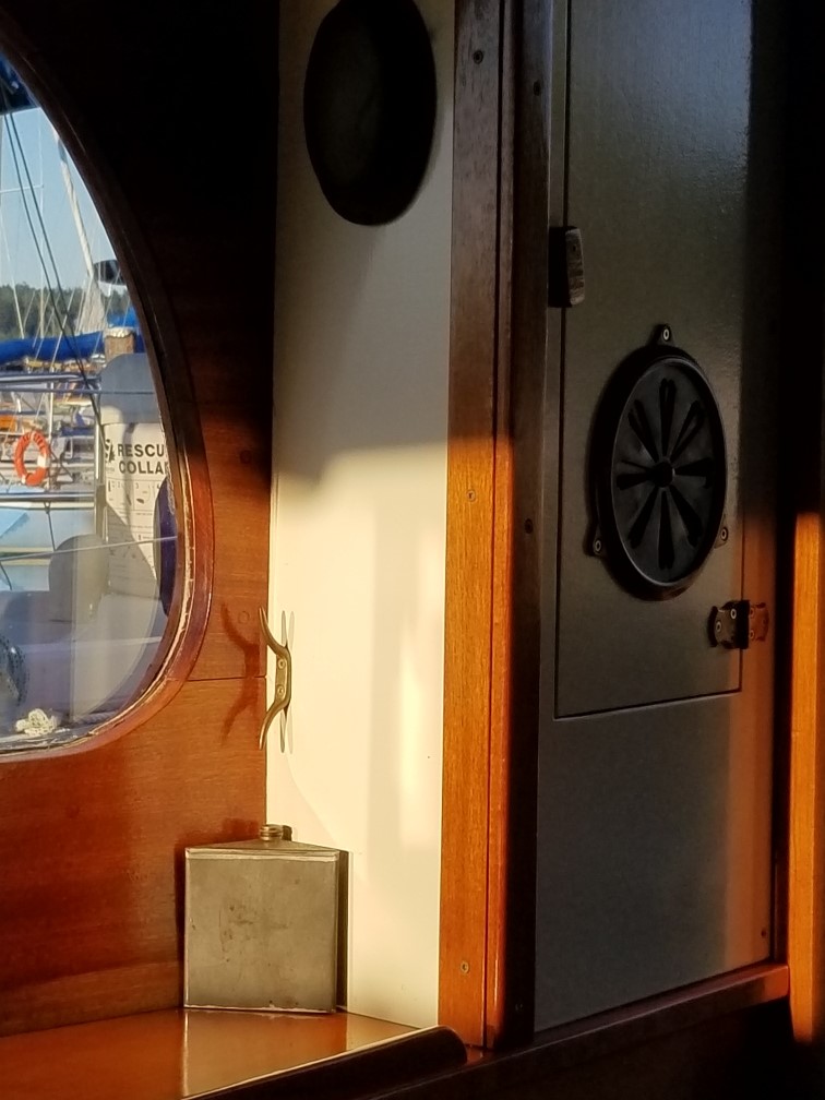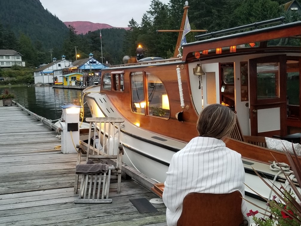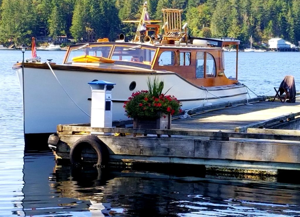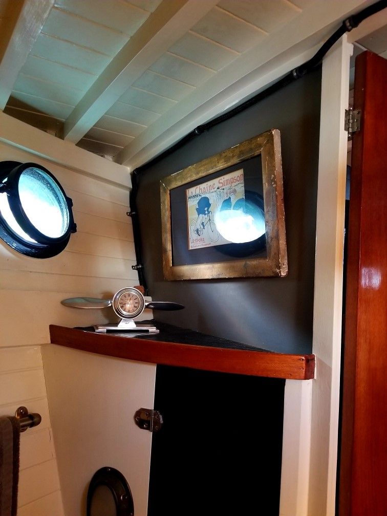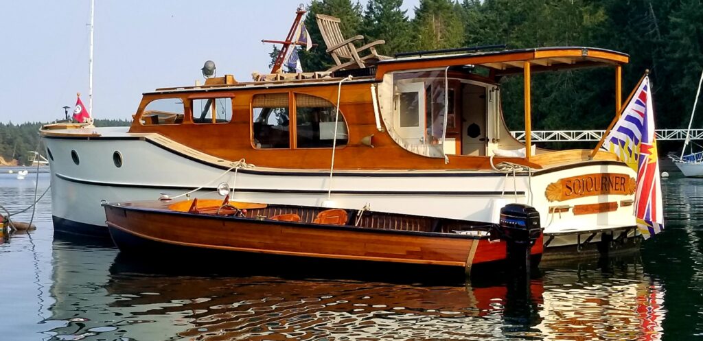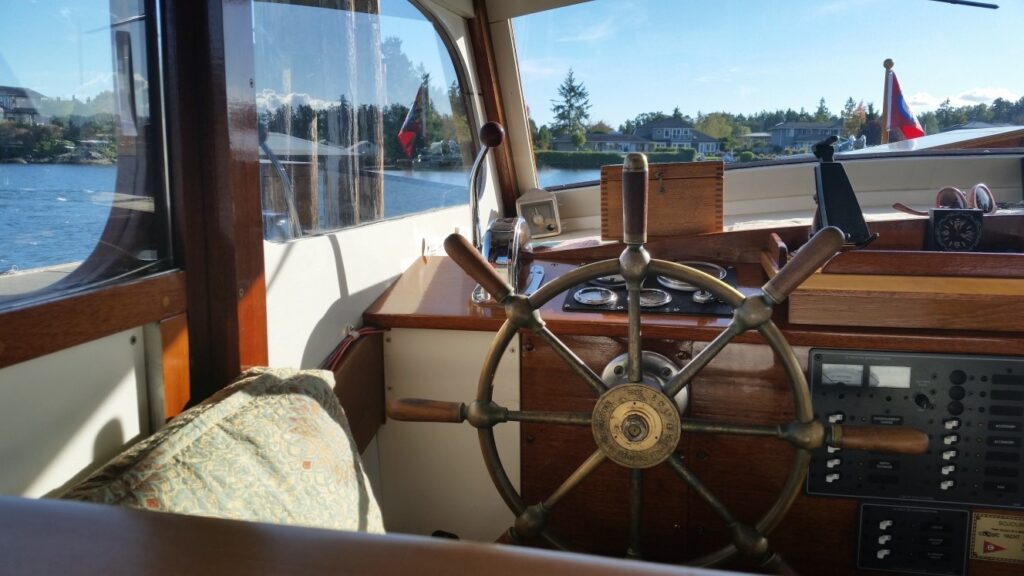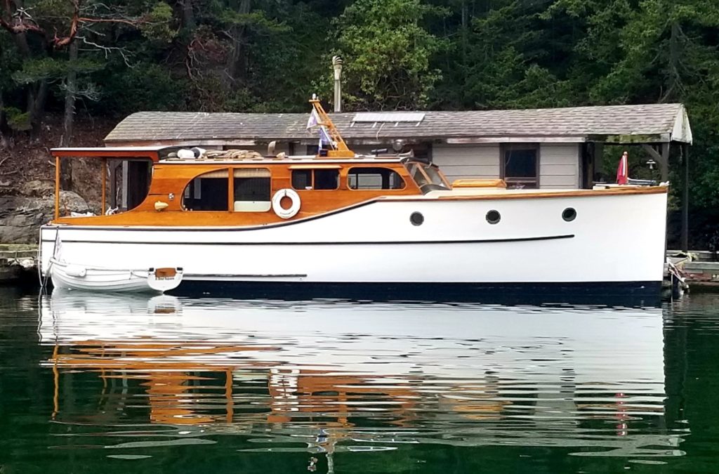 Found on the hard in the Port Townsend boatyard during the annual Wooden Boatshow in 2009, it fortunately had a good custodian for the 21 years previous. The smooth riding Monk hull had a blank canvas in the interior with no steering station and a makeshift galley in the bright main salon that fortunately included a beautiful 1940’s Magic Chef 3 burner propane stove with oven. The floating cottage has now had almost every surface addressed and glows with contrasting light paint, satin varnish on mahogany, and old growth fir countertops with a hammered copper vessel sink. The “locomotive’s” distinctive hardtop over the rear cockpit makes this the prime spot to enjoy our beautiful local surroundings sliding by while under way, the morning coffee to wake up to, and the glass of wine in the evening to wrap up another day on the water.