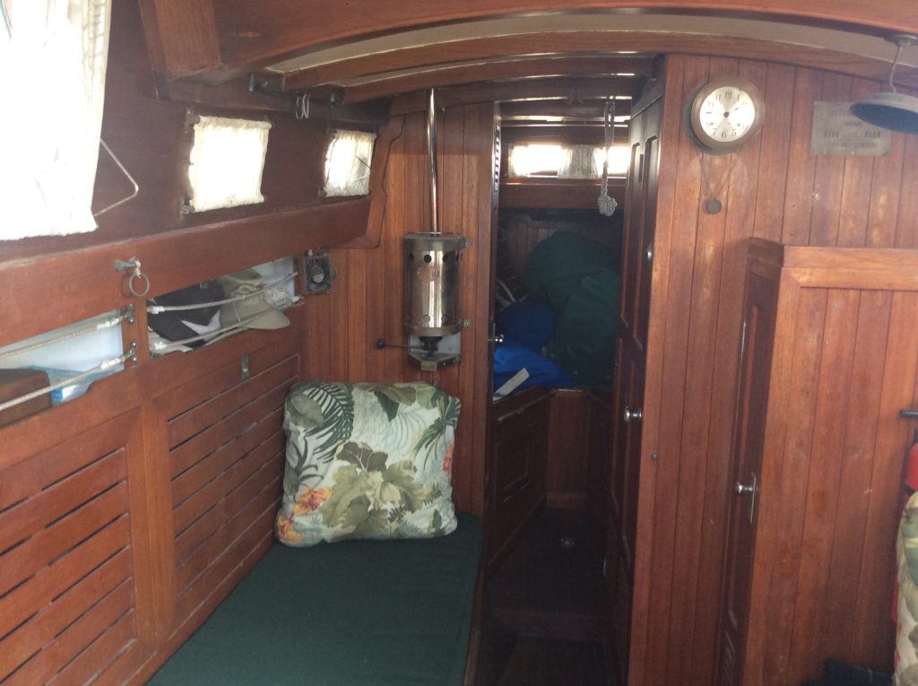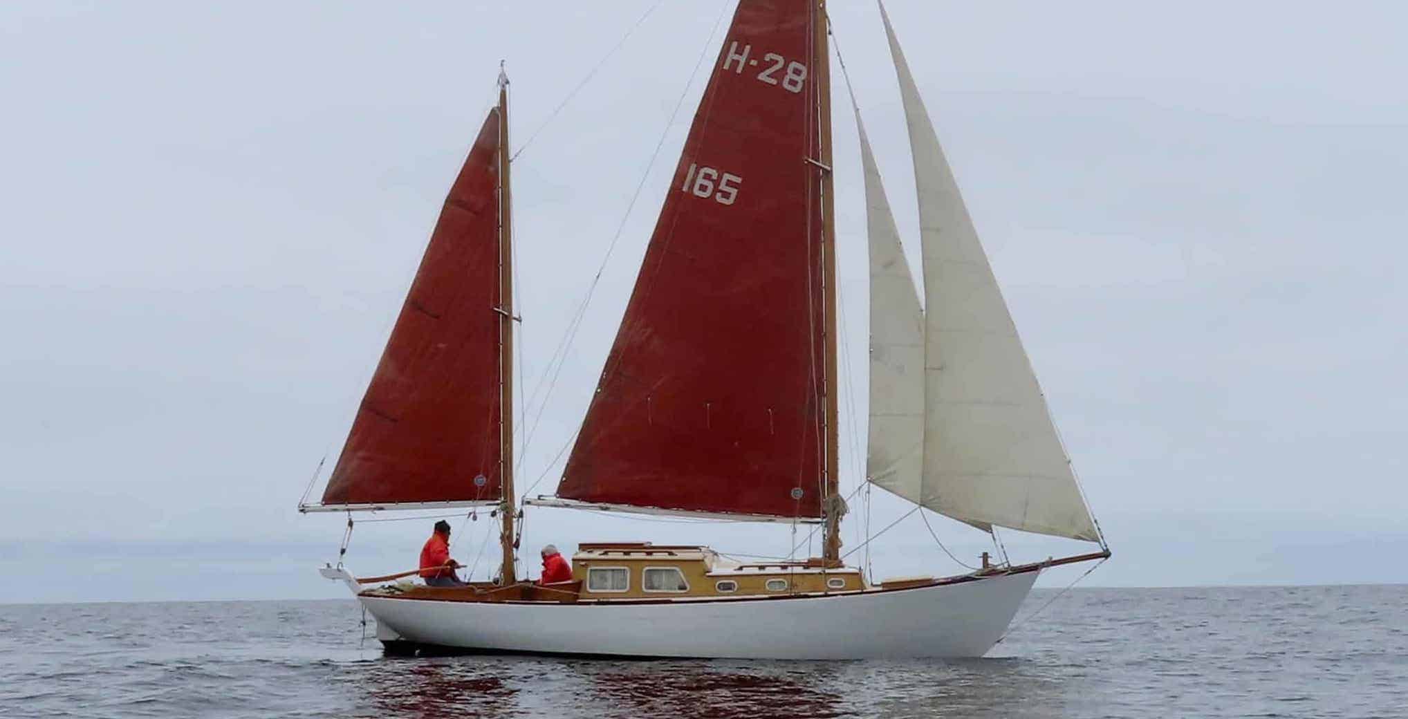 This is a Herreshoff 28 modified wooden ketch built by Far East Yachts, Japan, and commissioned on April 15, 1966. Number 82. She was purchased by a Howard J. Nelson and named Sea Brig. I bought her from her second owner five years ago, who had renamed her Taylor Rose, after his daughter. We just call her Rosy. She had not been sailed for ten years. She is double-planked mahogany over oak. I did the restoration myself and have kept her in her original simple style although the cedar bucket was “upgraded” to a legal marine sanitation system. Her two burner stove, Force 10 heater and lamps all operate on kerosene. I bought a set of tan bark sails for $300 and so her sail number isn’t 82. My wife