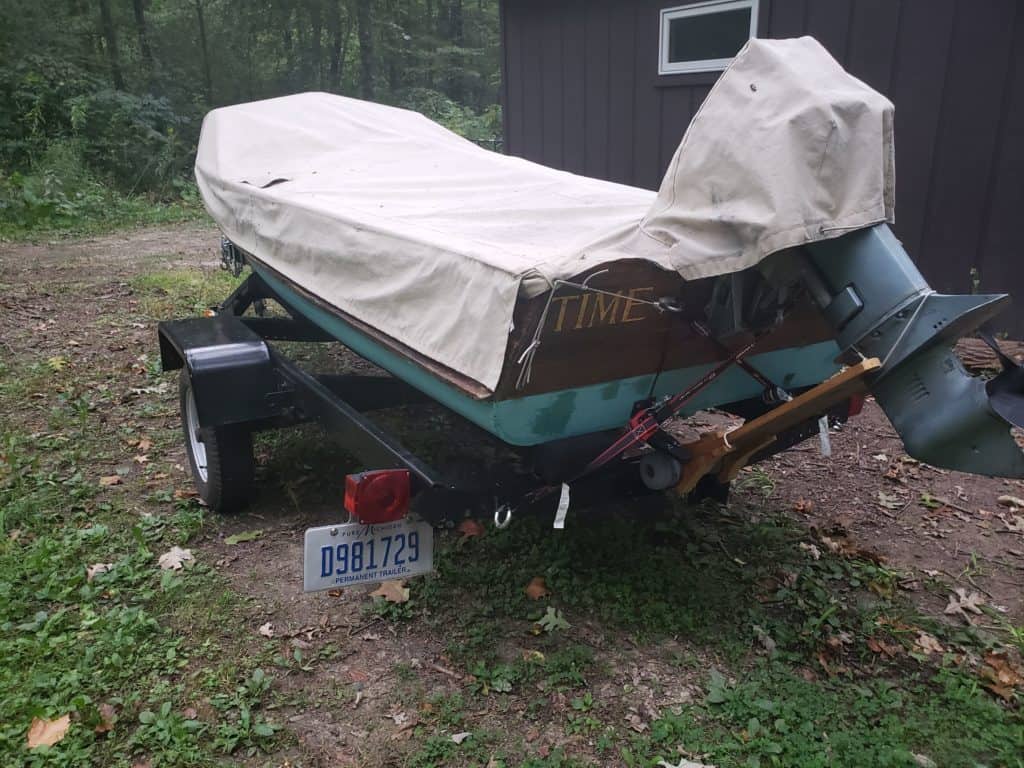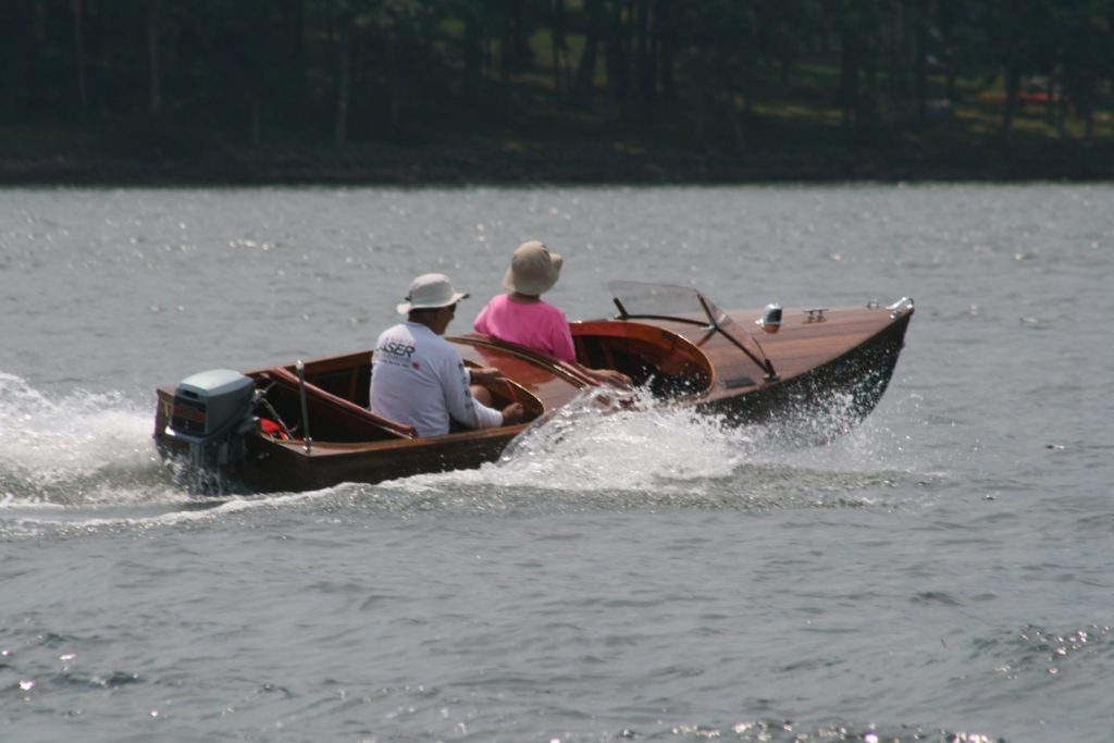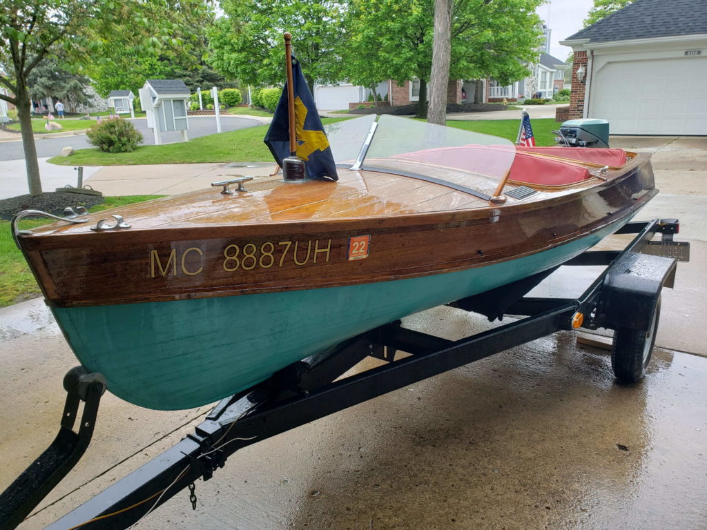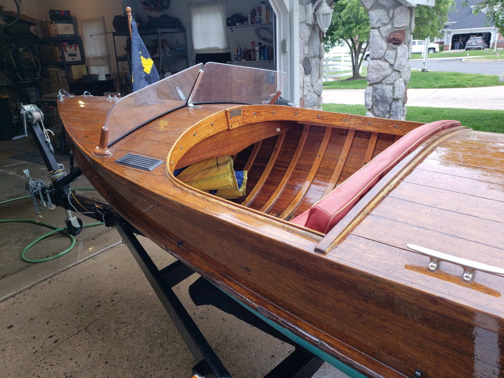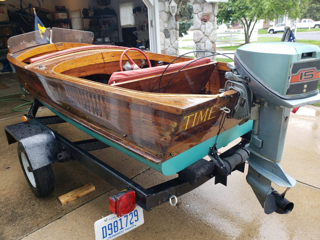 I took my time restoring this Shell Lake Deluxe Cormorant, spending eight years on the project. Purchased in 2004 from a neighbor at Sage Lake near Lupton, Michigan. We spent several summers occasionally working on TIME there before I transported her from Sage Lake to our home in Annapolis, Maryland, in 2006.There, I refastened her completely with silicon bronze screws in epoxy-filled and redrilled holes, replaced the oak keel, and scarfed and replaced some new frame sections. Except for those few pieces, TIME has all of her original structure and equipment. She races around at over 20 knots with her 1982, 15-hp Evinrude.