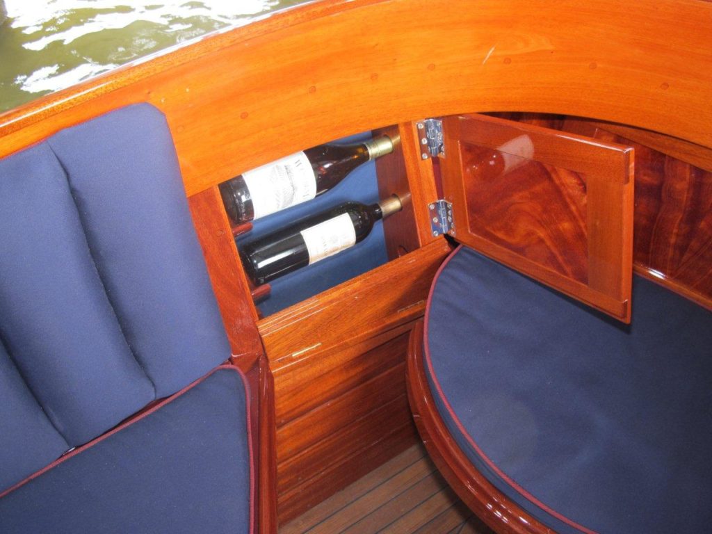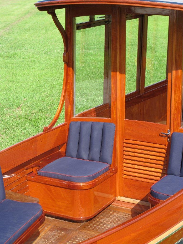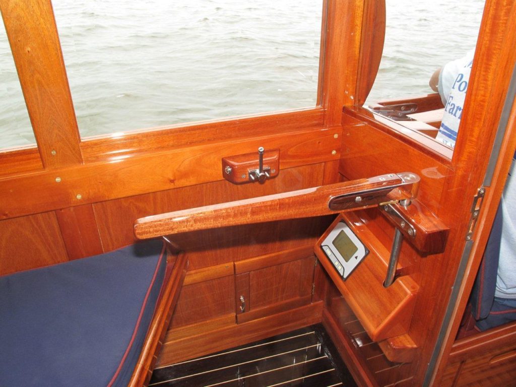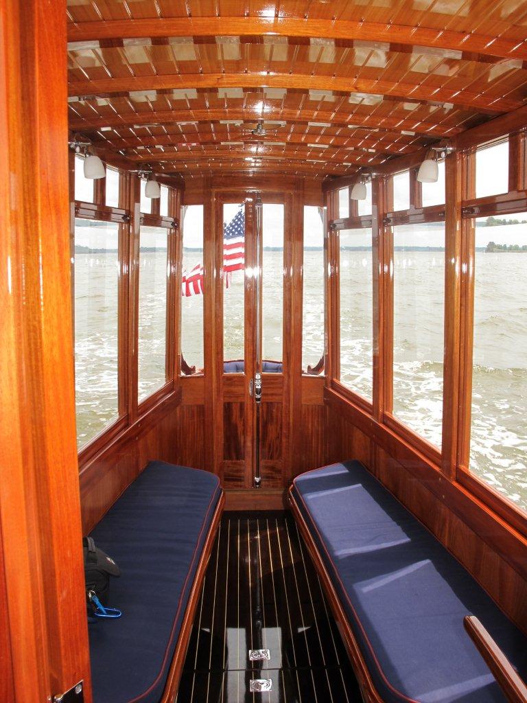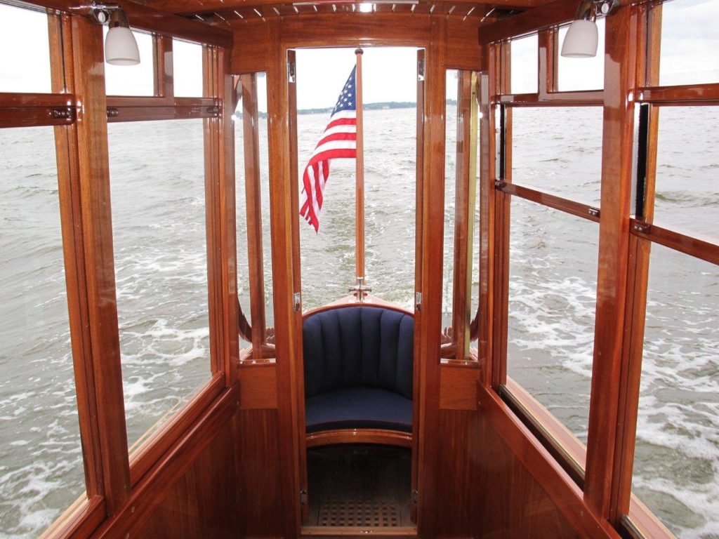 In calm weather the large beveled glass side windows can open down into the hull to provide plenty of ventilation for the cabin area. Another unique feature is the dual driving stations, one inside the cabin and one out.