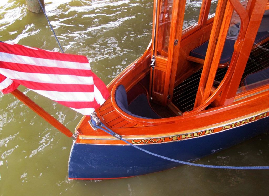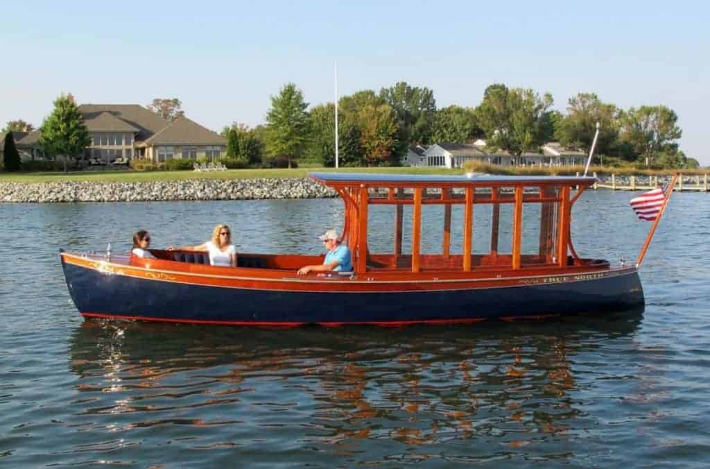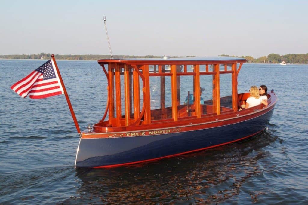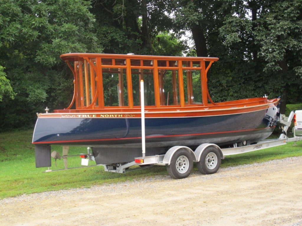 Electric powered 27′ mahogany cabin launch custom built by Budsin Electric Boats. The torpedo stern hull is cold molded of Atlantic White Cedar (Juniper), and the cabin is mainly of Genuine Mahogany.