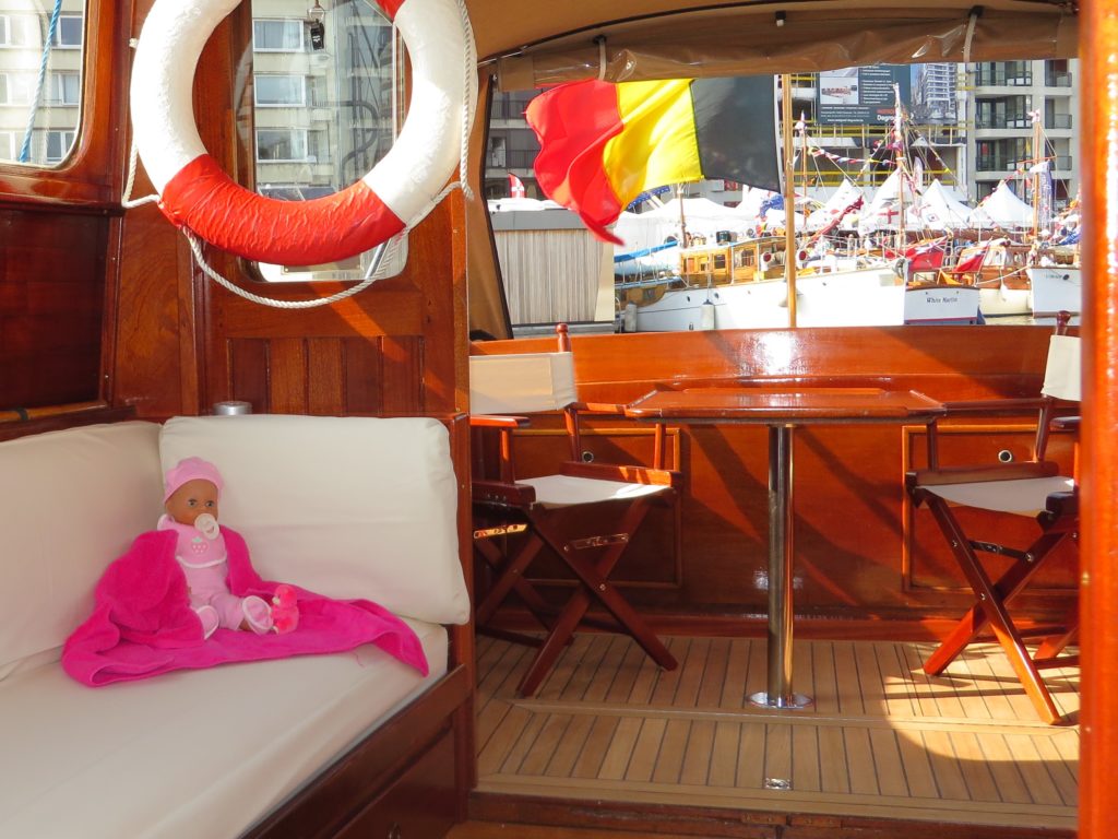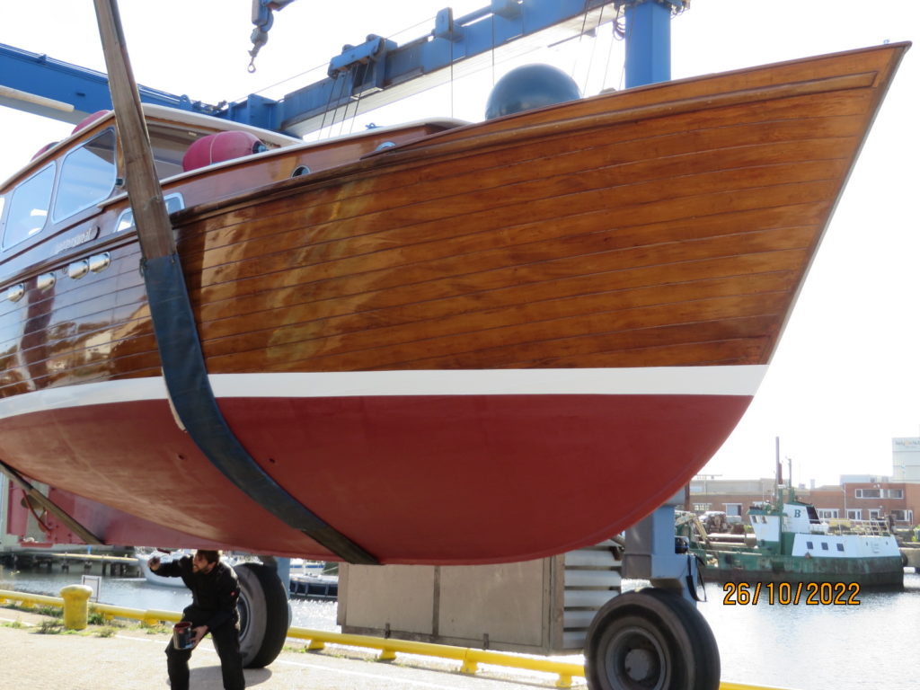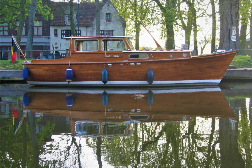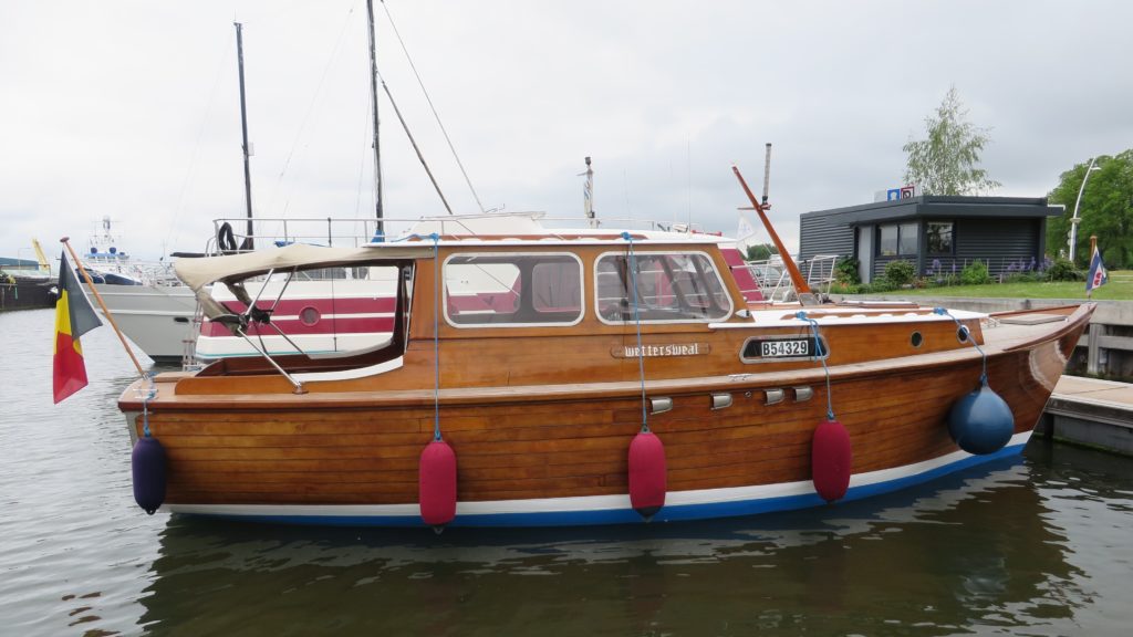 A One-Off, built on special order in Friesland as a beamy round-bilge for rivers and lakes . Her exterior is all original varnished mahogany Honduras , still in excellent condition , making her a real eye-catcher . After acquisition in 2005 , half of her planking BWL was replaced before undertaking the fantastic trip to Belgium , crossing the Netherlands from N to S by inland waterways . She proved a real joy to sail and pleased surprisingly by the many tumbs go up ! During the following years no effort was spared to gradually rebuilt the complete interior , to add comfort and renew technical equipment , always well-considered for still allowing changes following the preferences or kind of use of a next owner .