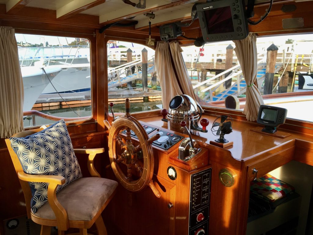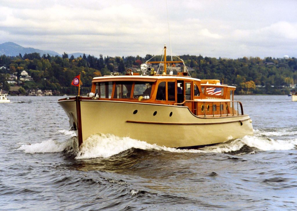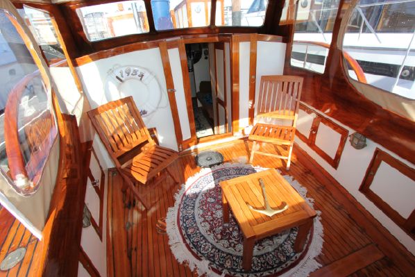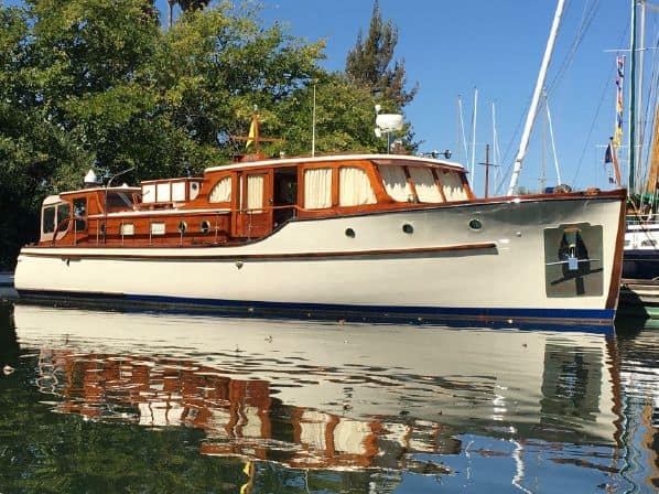 A large commission for designer Ed Monk, the 50′ bridge-deck cruiser Marilynn III was launched in 1938, one of four sister ships built by the Lakewood Boat Company in Renton, Washington. She was bought from owner Dr. Hay by Gordon and Beverly Sullivan, and re-named Migrator III. In 1993 she was purchased by Lew and Lindy Barrett, who re-named her Rita. In 2012, she was relocated to the Northern California region, where she is currently berthed in Sausalito and regularly cruises the bay. Like many other Puget Sound boats she was used by the military in World War II.Already a member? Log in herePhotos