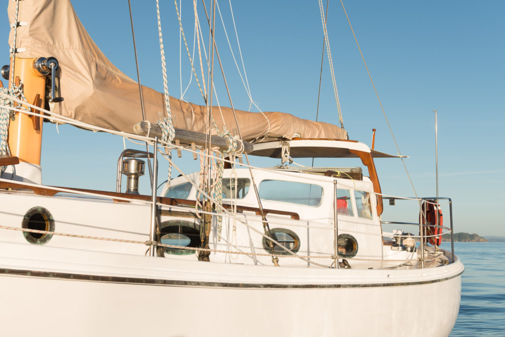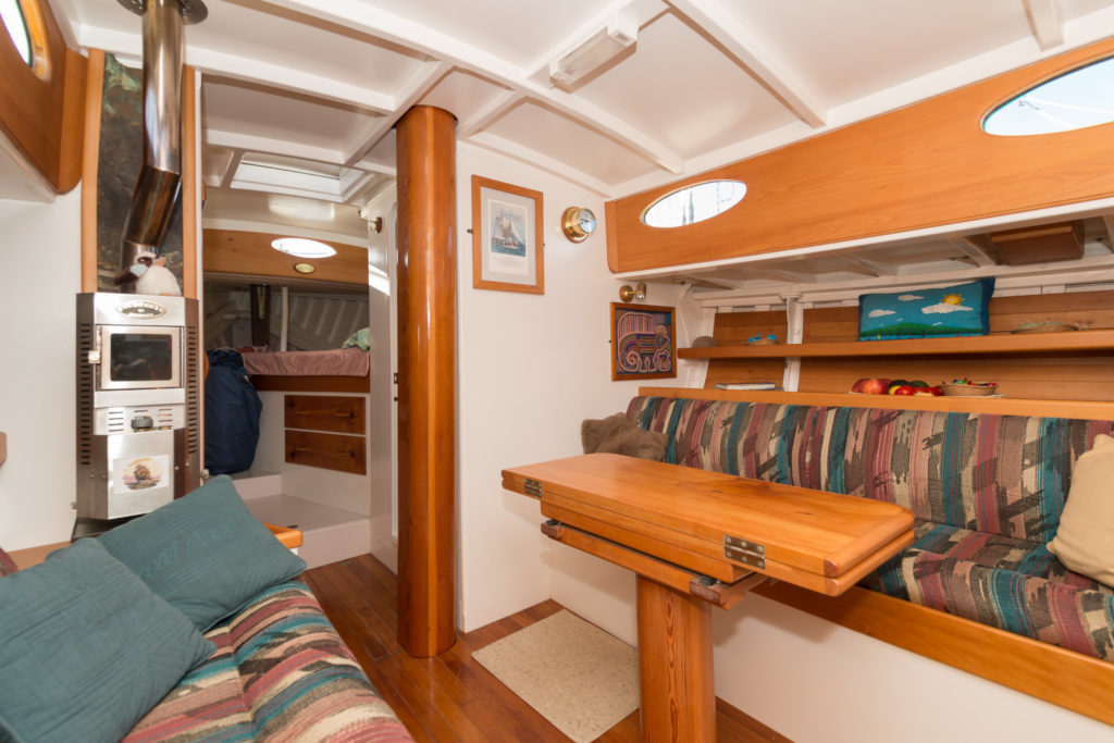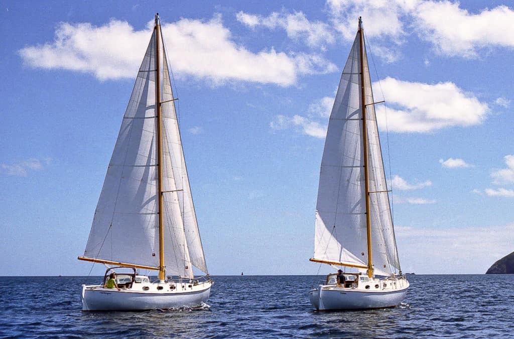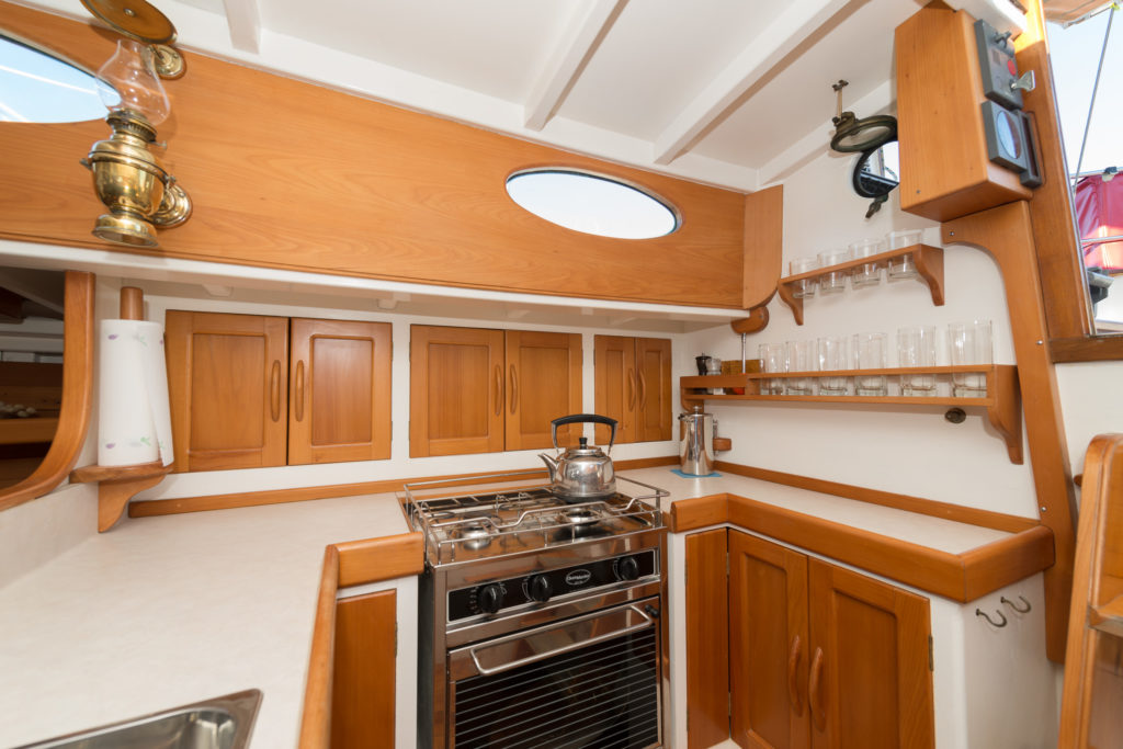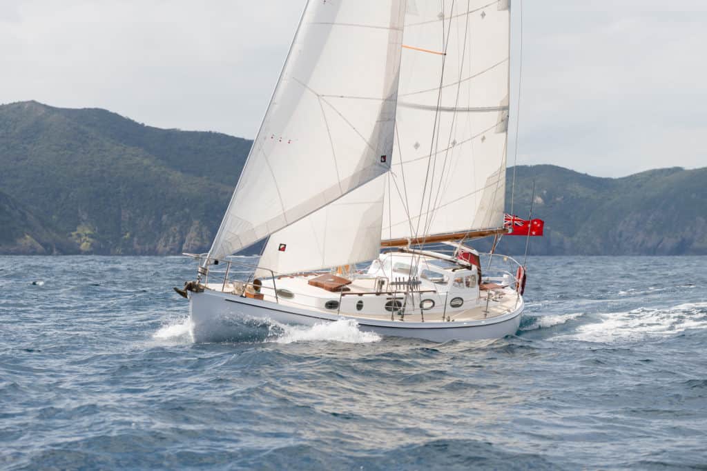 I admired the looks and characteristics of the Danish Spidsgatter’s and with these vessels in mind I designed a vessel to suit our requirements, 38 ft O.A. x 12 ft beam x 5’8” draught, keeping the displacement to 12 tons. 1 1/4” Kauri carvel planking on steam bent Saligna frames, Saligna being an Australian hardwood that steams well. The timber keel, stem timber and floors are Tanakaha with natural Pohutukawa stern and forefoot knees, the lead ballast keels are four and a half tons. Being wooden yachts for us they had to have wooden spars, the mast and boom’s being Oregon Pine ( Douglas fir ).