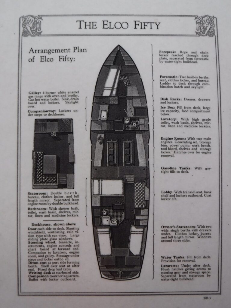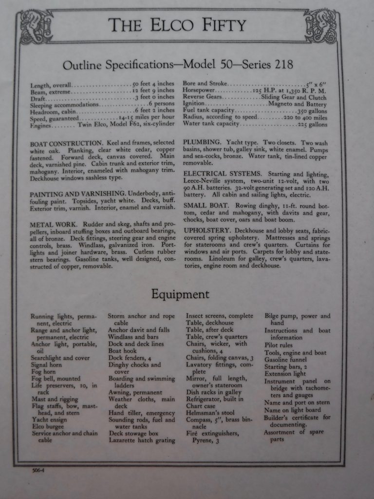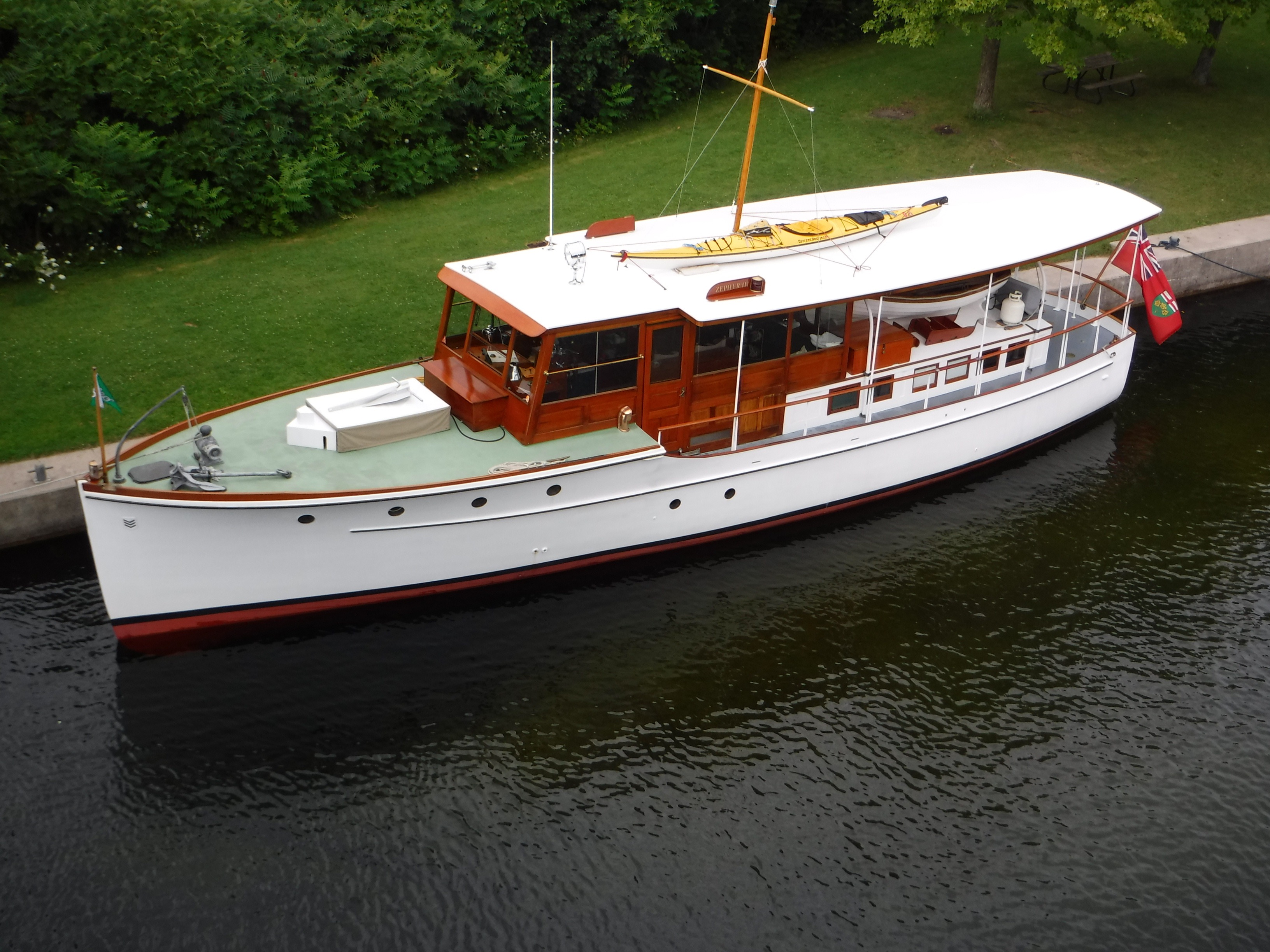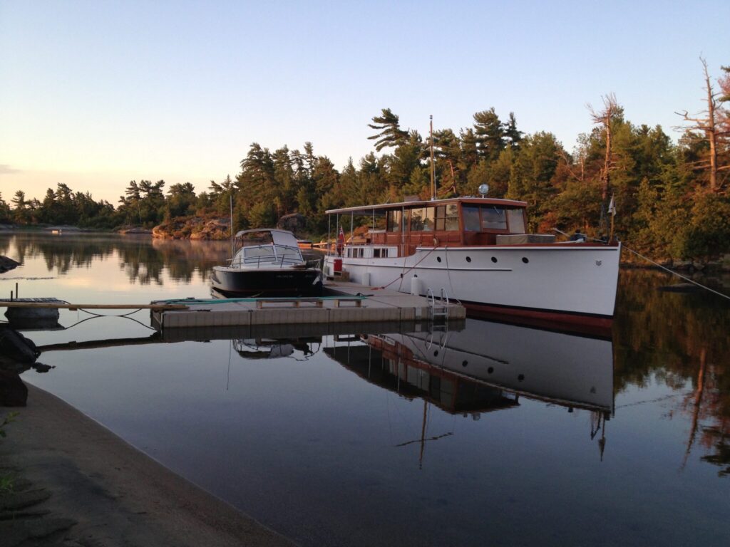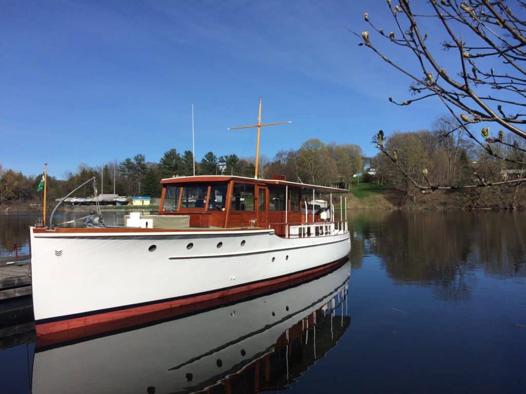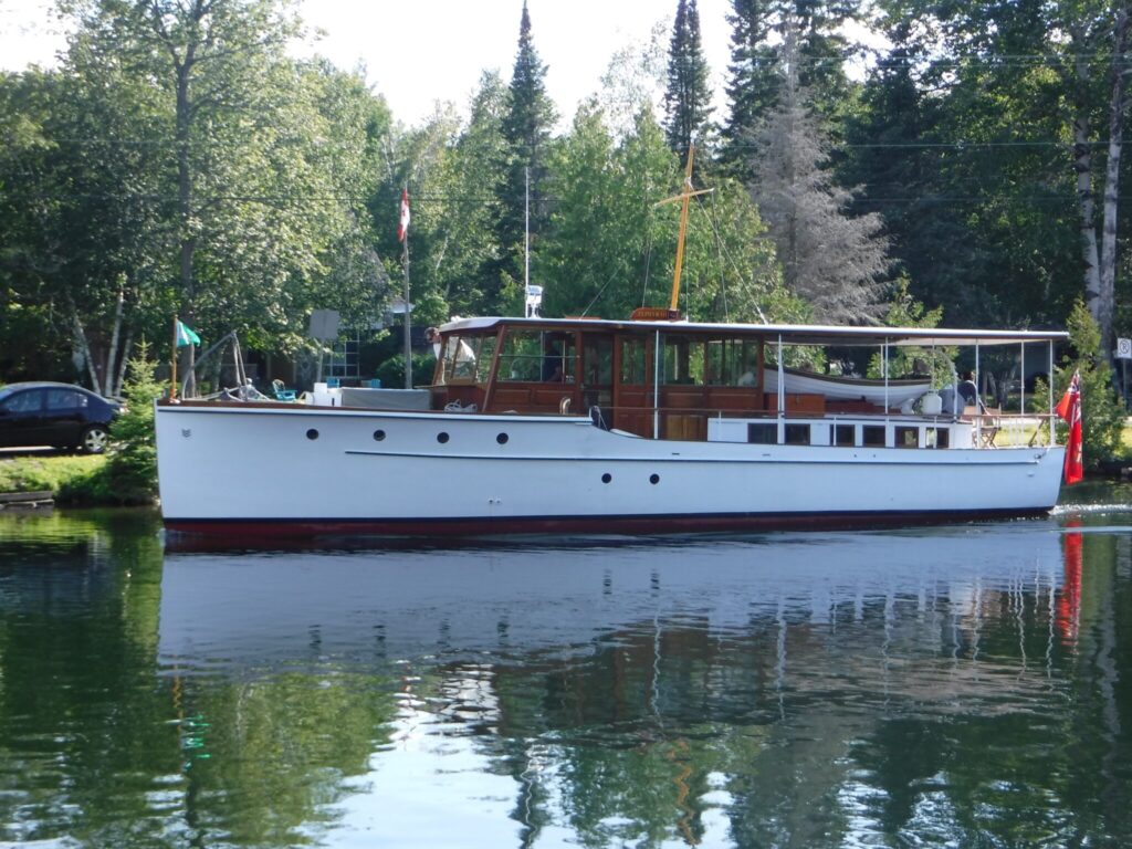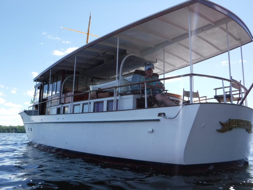 Zephyr is an excellent example of a 50′ Elco Flattop motoryacht being one of several production models for which Elco was highly regarded.She has ventured as far as Parry Sound in Georgian Bay through the Trent Severn waterway and Ottawa via the Rideau canal. She also participated in the Antique and Classic Boat show at Clayton N.Y. where on three separate occasions she received the Best Preserved Cruiser award. Montreal is on the list for 2024, perhaps revisiting Ottawa.